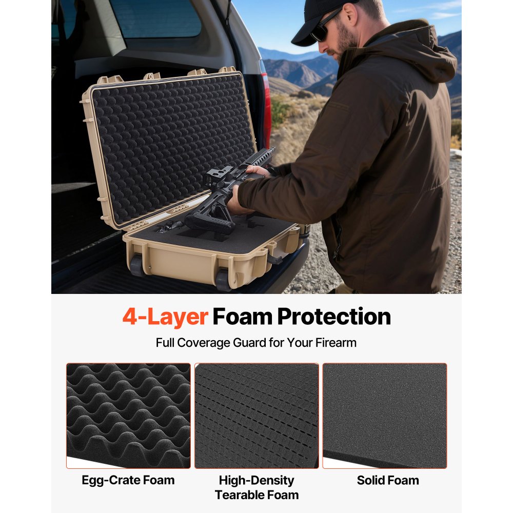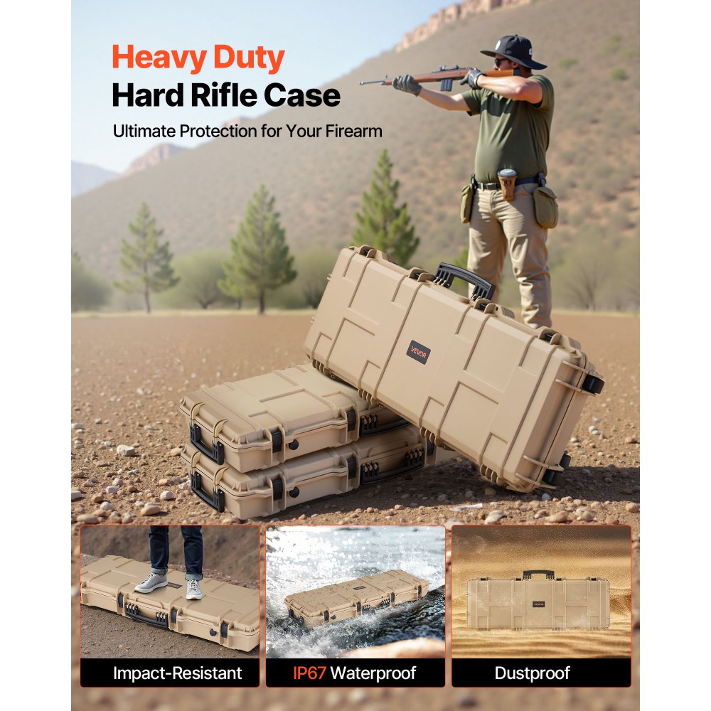 IP67 Αδιάβροχη και ανθεκτική στη σκόνη: Αυτή η σκληρή θήκη τουφέκι διαθέτει ένα ανθεκτικό, ανθεκτικό στις κρούσεις εξωτερικό με προστασία IP67 για το νερό και τη σκόνη, εξασφαλίζοντας έναν πλήρως σφραγισμένο σχεδιασμό που κρατά το νερό έξω. Προστατεύει τα όπλα σας από τις σκληρές καιρικές συνθήκες. Συμμορφώνεται με τα πρότυπα TSA: Αυτή η θήκη τουφέκι πληροί τα πρότυπα της TSA και είναι κατάλληλη για ταξίδια σε αεροπλάνα, τρένα και άλλα μέσα μεταφοράς. Εξοπλισμένη με πολλαπλά μάνδαλα, μπορείτε επίσης να προσθέσετε λουκέτα στις ενσωματωμένες οπές κλειδαριάς για επιπλέον ασφάλεια (Σημείωση: τα λουκέτα δεν περιλαμβάνονται) Αφρός 4 στρώσεων: Η θήκη του όπλου μας διαθέτει 4 στρώσεις μαλακού αφρού: 1 στρώση αφρού τύπου αυγοθήκης για απορρόφηση κραδασμών, 2 στρώσεις προκομμένου αφρού για άνετη εφαρμογή, 1 στρώση συμπαγούς αφρού για επιπλέον στήριξη. Μπορείτε να προσαρμόσετε τις θήκες στα σχήματα του τουφέκι σας. Μακράς Διάρκειας: Κατασκευασμένη με μεταλλικούς μεντεσέδες, αυτή η θήκη είναι πιο ανθεκτική στη φθορά από τις πλαστικές εναλλακτικές. Αντέχει στο επαναλαμβανόμενο άνοιγμα και κλείσιμο χωρίς συμβιβασμούς. Η θήκη διαθέτει βαλβίδα εξισορρόπησης πίεσης για τη ρύθμιση και την εξισορρόπηση της εσωτερικής πίεσης αέρα. Φορητή και εύκολη στη μετακίνηση: Εξοπλισμένη με δύο αθόρυβους τροχούς, αυτή η σκληρή θήκη όπλου μπορεί να μεταφερθεί αβίαστα σε δημόσιους χώρους, ελαχιστοποιώντας την αναστάτωση. Οι πολλαπλές εργονομικές λαβές κάνουν την ανύψωση και τη μεταφορά απλή, προσφέροντας μέγιστη ευελιξία και ευκολία.