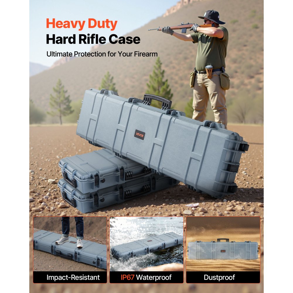 IP67 Αδιάβροχη και ανθεκτική στη σκόνη: Αυτή η σκληρή θήκη τουφέκι διαθέτει ένα ανθεκτικό, ανθεκτικό στις κρούσεις εξωτερικό με προστασία IP67 για το νερό και τη σκόνη, εξασφαλίζοντας έναν πλήρως σφραγισμένο σχεδιασμό που κρατά το νερό έξω. Προστατεύει τα όπλα σας από τις σκληρές καιρικές συνθήκες. Συμμορφώνεται με τα πρότυπα TSA: Αυτή η θήκη τουφέκι πληροί τα πρότυπα της TSA και είναι κατάλληλη για ταξίδια σε αεροπλάνα, τρένα και άλλα μέσα μεταφοράς. Εξοπλισμένη με πολλαπλά μάνδαλα, μπορείτε επίσης να προσθέσετε λουκέτα στις ενσωματωμένες οπές κλειδαριάς για επιπλέον ασφάλεια (Σημείωση: τα λουκέτα δεν περιλαμβάνονται) Αφρός 4 στρώσεων: Η θήκη του όπλου μας διαθέτει 4 στρώσεις μαλακού αφρού: 1 στρώση αφρού τύπου αυγοθήκης για απορρόφηση κραδασμών, 2 στρώσεις προκομμένου αφρού για άνετη εφαρμογή, 1 στρώση συμπαγούς αφρού για επιπλέον στήριξη. Μπορείτε να προσαρμόσετε τις θήκες στα σχήματα του τουφέκι σας. Μακράς Διάρκειας: Κατασκευασμένη με μεταλλικούς μεντεσέδες, αυτή η θήκη είναι πιο ανθεκτική στη φθορά από τις πλαστικές εναλλακτικές. Αντέχει στο επαναλαμβανόμενο άνοιγμα και κλείσιμο χωρίς συμβιβασμούς. Η θήκη διαθέτει βαλβίδα εξισορρόπησης πίεσης για τη ρύθμιση και την εξισορρόπηση της εσωτερικής πίεσης αέρα. Φορητή και εύκολη στη μετακίνηση: Εξοπλισμένη με δύο αθόρυβους τροχούς, αυτή η σκληρή θήκη όπλου μπορεί να μεταφερθεί αβίαστα σε δημόσιους χώρους, ελαχιστοποιώντας την αναστάτωση. Οι πολλαπλές εργονομικές λαβές κάνουν την ανύψωση και τη μεταφορά απλή, προσφέροντας μέγιστη ευελιξία και ευκολία.