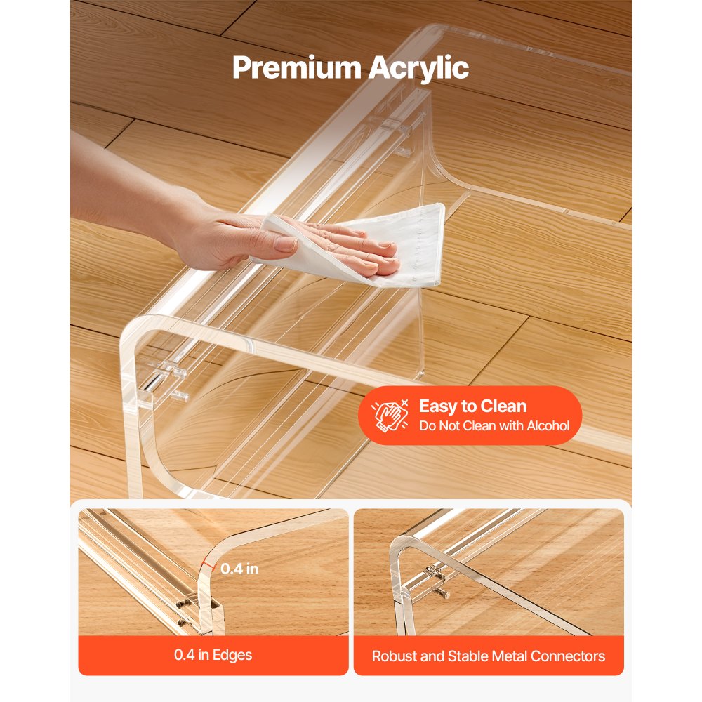 Φυσικό ακρυλικό υλικό: Κατασκευασμένο από υψηλής ποιότητας ακρυλικό, αυτό το ακρυλικό τραπέζι έχει μια κρυστάλλινη επιφάνεια που παραμένει φωτεινή με την πάροδο του χρόνου. Πιο ανθεκτικό στις κρούσεις από το σκληρυμένο γυαλί, αποτελεί μια ασφαλή και στιβαρή επιλογή, ειδικά για σπίτια με παιδιά και κατοικίδια. Σταθερό και στιβαρό: Αυτό το ακρυλικό γραφείο διαθέτει επιφάνεια πάχους 0,4 ίντσες/1 εκ., που υποστηρίζει έως και 40 κιλά στο πάνω μέρος και 10 κιλά στο κάτω μέρος. Οι ισχυροί μεταλλικοί σύνδεσμοι εξασφαλίζουν μακροχρόνια ανθεκτικότητα, προσφέροντας σταθερή στήριξη για υπολογιστές, βιβλία και καθημερινά αντικείμενα. Διπλός χώρος αποθήκευσης: Αυτό το ακρυλικό τραπεζάκι σαλονιού διαθέτει ευρύχωρο αποθηκευτικό χώρο 2 επιπέδων για φορητούς υπολογιστές, βιβλία, έγγραφα και διακοσμητικά. Η διαφανής επιφάνεια του τραπεζιού προσφέρει ανεμπόδιστη θέα, διευκολύνοντας την εύρεση ό,τι χρειάζεστε—ιδανικό ως τραπεζάκι σαλονιού ή γραφείο υπολογιστή. Εύκολη συναρμολόγηση και καθάρισμα: Το εξάρτημα και οι οδηγίες κάνουν τη συναρμολόγηση γρήγορη. Για συντήρηση, σκουπίστε με νερό ή ακρυλικό καθαριστικό. (Σημείωση: Αφαιρέστε την προστατευτική μεμβράνη μετά τη συναρμολόγηση. Μην χρησιμοποιείτε οινόπνευμα για τον καθαρισμό και αποφύγετε τη μακροχρόνια έκθεση στο ηλιακό φως σε εξωτερικούς χώρους.) Ταιριάξτε με το στυλ του σπιτιού σας: Το ακρυλικό βοηθητικό τραπεζάκι μας έχει κρυστάλλινη λάμψη με έως και 92% μετάδοση φωτός. Η διαφάνειά του δημιουργεί ανοιχτότητα, ακόμη και σε μικρότερους χώρους. Συνδυάζεται με διάφορα στυλ σπιτιού, ιδανικά για σαλόνια, υπνοδωμάτια, εισόδους ή μπάνια.