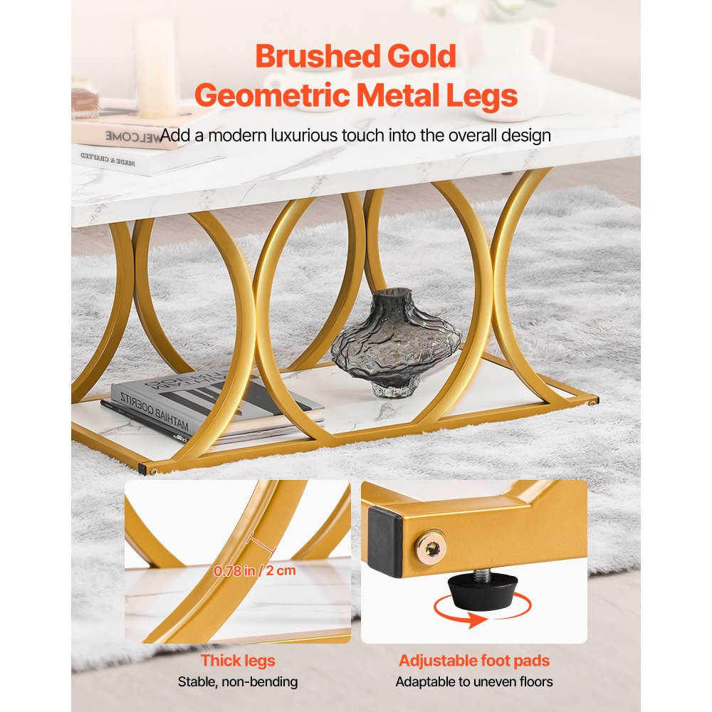 Σχεδιασμός 2 επιπέδων: Με μεγάλη επιφάνεια, το τραπεζάκι σαλονιού χωράει εύκολα βιβλία, ποτήρια νερού, φορητούς υπολογιστές και σνακ για εύκολη πρόσβαση. Προσθέτει μικρότερο χώρο αποθήκευσης στο κάτω μέρος για την αποθήκευση καθημερινών μικρών αντικειμένων, βελτιώνοντας την αποτελεσματικότητα της αποθήκευσης. Κλασικό Μοντέρνο Στυλ: Το ορθογώνιο τραπέζι μας διαθέτει λευκή μαρμάρινη επιφάνεια με επιχρυσωμένα γεωμετρικά μεταλλικά πόδια. Το χρυσό μεταλλικό σκελετό του προσθέτει ένα μοναδικό βιομηχανικό μοντέρνο στυλ, καθιστώντας το μια εξαιρετική διακόσμηση σπιτιού και ιδανικό για χαλάρωση με φίλους και οικογένεια. Σταθερή Στήριξη: Κατασκευασμένο από μεταλλικό σκελετό, το ξύλινο τραπεζάκι σαλονιού αντέχει σταθερά έως και 91 κιλά. Το ψημένο χρώμα αντέχει στη διάβρωση, τη σκουριά και την παραμόρφωση για μακροχρόνια χρήση. Τα ρυθμιζόμενα πόδια του είναι επίπεδα σε ανώμαλα δάπεδα για να διατηρείται το τραπεζάκι σαλονιού σταθερό. Εύκολη εγκατάσταση και καθαρισμός: Ακολουθήστε τις σαφείς οδηγίες για γρήγορη συναρμολόγηση. Διαθέτοντας επιφάνεια από μοριοσανίδα, το κεντρικό μας τραπέζι από ξύλο είναι αδιάβροχο και ανθεκτικό στη φθορά για μακροχρόνια χρήση. Οι λεκέδες μπορούν να σκουπιστούν εύκολα για μια φωτεινή, καθαρή επιφάνεια. Ευέλικτη χρήση: Ιδανικό για υπνοδωμάτια, δωμάτια επισκεπτών, γραφεία ή ως τραπεζάκι σαλονιού, βοηθητικό τραπεζάκι, γραφείο ή τραπέζι βεράντας, το μεταλλικό τραπεζάκι σαλονιού μας συμπληρώνει κάθε στυλ διακόσμησης. Σημείωση: Τα χρώματα ενδέχεται να διαφέρουν ελαφρώς από τις εικόνες λόγω του φωτισμού και των ρυθμίσεων της οθόνης.