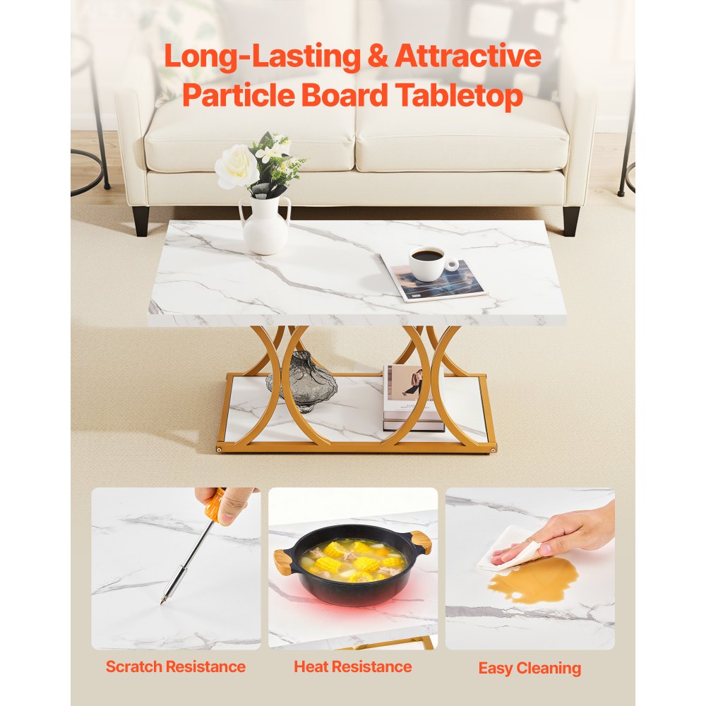 Σχεδιασμός 2 επιπέδων: Με μεγάλη επιφάνεια, το τραπεζάκι σαλονιού χωράει εύκολα βιβλία, ποτήρια νερού, φορητούς υπολογιστές και σνακ για εύκολη πρόσβαση. Προσθέτει μικρότερο χώρο αποθήκευσης στο κάτω μέρος για την αποθήκευση καθημερινών μικρών αντικειμένων, βελτιώνοντας την αποτελεσματικότητα της αποθήκευσης. Κλασικό Μοντέρνο Στυλ: Το ορθογώνιο τραπέζι μας διαθέτει λευκή μαρμάρινη επιφάνεια με επιχρυσωμένα γεωμετρικά μεταλλικά πόδια. Το χρυσό μεταλλικό σκελετό του προσθέτει ένα μοναδικό βιομηχανικό μοντέρνο στυλ, καθιστώντας το μια εξαιρετική διακόσμηση σπιτιού και ιδανικό για χαλάρωση με φίλους και οικογένεια. Σταθερή Στήριξη: Κατασκευασμένο από μεταλλικό σκελετό, το ξύλινο τραπεζάκι σαλονιού αντέχει σταθερά έως και 91 κιλά. Το ψημένο χρώμα αντέχει στη διάβρωση, τη σκουριά και την παραμόρφωση για μακροχρόνια χρήση. Τα ρυθμιζόμενα πόδια του είναι επίπεδα σε ανώμαλα δάπεδα για να διατηρείται το τραπεζάκι σαλονιού σταθερό. Εύκολη εγκατάσταση και καθαρισμός: Ακολουθήστε τις σαφείς οδηγίες για γρήγορη συναρμολόγηση. Διαθέτοντας επιφάνεια από μοριοσανίδα, το κεντρικό μας τραπέζι από ξύλο είναι αδιάβροχο και ανθεκτικό στη φθορά για μακροχρόνια χρήση. Οι λεκέδες μπορούν να σκουπιστούν εύκολα για μια φωτεινή, καθαρή επιφάνεια. Ευέλικτη χρήση: Ιδανικό για υπνοδωμάτια, δωμάτια επισκεπτών, γραφεία ή ως τραπεζάκι σαλονιού, βοηθητικό τραπεζάκι, γραφείο ή τραπέζι βεράντας, το μεταλλικό τραπεζάκι σαλονιού μας συμπληρώνει κάθε στυλ διακόσμησης. Σημείωση: Τα χρώματα ενδέχεται να διαφέρουν ελαφρώς από τις εικόνες λόγω του φωτισμού και των ρυθμίσεων της οθόνης.