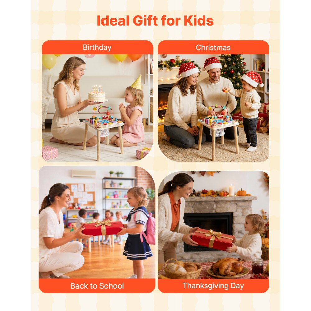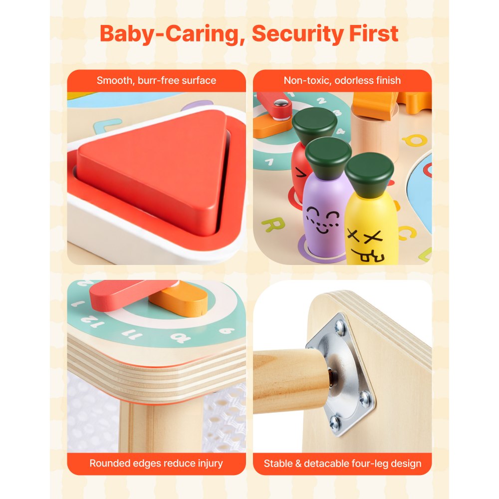 Πλήρης Αισθητηριακή Μάθηση Montessori: Αυτό το τραπέζι εκμάθησης Montessori συνδυάζει σχήματα, υφές και ήχους για ηλικίες 6+ μηνών! Κάθε άγγιγμα ενισχύει τον συντονισμό χεριού-ματιού, τις πρώτες λέξεις και την οπτική παρακολούθηση - ποιος ήξερε ότι η μάθηση θα μπορούσε να είναι τόσο διασκεδαστική. Σχεδιασμός Πολλαπλών Δραστηριοτήτων: Αυτό το γραφείο δραστηριοτήτων εκμάθησης προσθέτει ταξινόμηση χρωμάτων και σχημάτων, παιχνίδι ψαρέματος, λαβύρινθο από χάντρες, περιστρεφόμενα γρανάζια, δείκτη ρολογιού, μάζεμα καρότων και ρυθμικό πληκτρολόγιο - τόσα πολλά να δοκιμάσετε! Είστε έτοιμοι να εξερευνήσετε περισσότερα. Ποιοτική κατασκευή από ξύλο: Το τραπέζι δραστηριοτήτων Montessori χρησιμοποιεί ξύλο πάχους 0,6 ιντσών με φινίρισμα χαμηλής οσμής και η στιβαρή κατασκευή του αντέχει στο καθημερινό παιχνίδι, ώστε τα μικρά χεράκια να μπορούν να εξερευνούν με σιγουριά. Λεπτομέρειες με προτεραιότητα την ασφάλεια: Το τραπέζι εκμάθησης για νήπια διαθέτει ομαλή λείανση, στρογγυλεμένες γωνίες και σταθερή βάση με τέσσερα πόδια για τη μείωση των χτυπημάτων και των ανατροπών. Τα αποσπώμενα πόδια κάνουν την εγκατάσταση ή την αποθήκευση πανεύκολη. Διασκέδαση έτοιμη για δώρα: Το τραπέζι δραστηριοτήτων για νήπια προσκαλεί τα παιδιά να δημιουργήσουν ήχους και ιστορίες, να μοιραστούν συναισθήματα και να πυροδοτήσουν τη φαντασία τους—συμπεριλαμβανομένων στιγμιαίων χαμόγελων! Ποιος είναι έτοιμος για το επόμενο μίνι αριστούργημα;