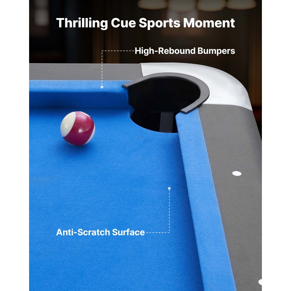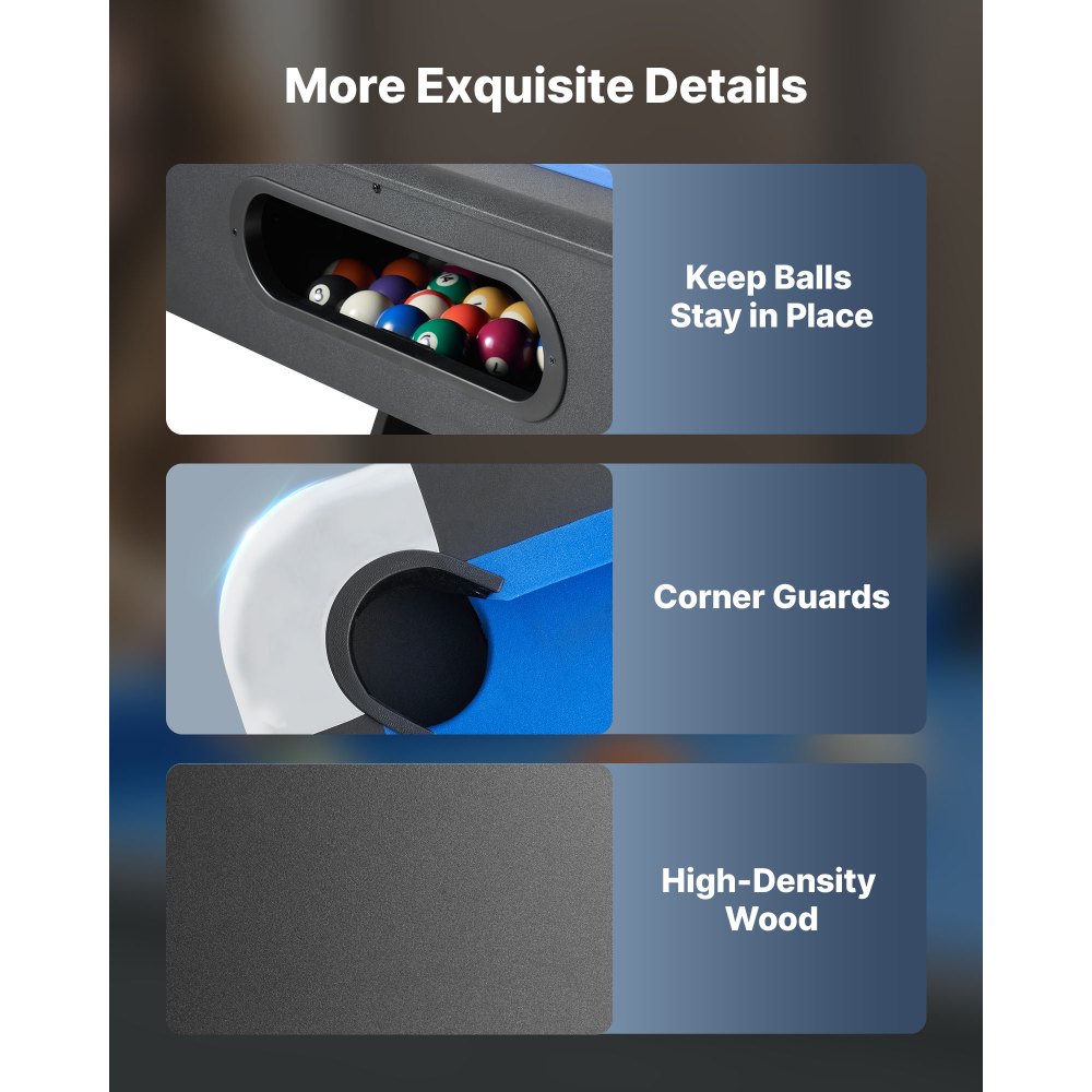 Ολοκληρωμένο κιτ: Στέκες, μπάλες, κιμωλία, πινέλο, τρίγωνο – όλα βρίσκονται στο κουτί. Δεν λείπουν εξαρτήματα. Ανοίξτε το τραπέζι μπιλιάρδου μας, ξεδιπλώστε τα πόδια και ξεκινήστε τον πρώτο σας αγώνα σε λίγα λεπτά. Γρήγορη και εύκολη συναρμολόγηση: Το προ-συναρμολογημένο πλαίσιο αυτού του τραπεζιού μπιλιάρδου σημαίνει ότι ξοδεύετε λιγότερο χρόνο στην κατασκευή και περισσότερο χρόνο στο παιχνίδι. Εξαιρετικές λεπτομέρειες: Τα ενισχυμένα δίχτυα συγκρατούν σφιχτά τις μπάλες, ενώ οι γωνίες προστατεύουν το τραπέζι και τους τοίχους σας. Τέλος στα γρατσουνισμένα πατώματα ή στα κεκλιμένα χτυπήματα. Η επιφάνεια από τσόχα υψηλής ποιότητας και ο προφυλακτήρας από μαλακό υλικό προσθέτουν μια πινελιά κομψότητας και ανθεκτικότητας στο τραπέζι μπιλιάρδου. Ανθεκτικό Πλαίσιο: Το πλαίσιο του σύγχρονου τραπεζιού μπιλιάρδου είναι κατασκευασμένο από υψηλής ποιότητας MDF, το οποίο είναι στιβαρό και ανθεκτικό για μακροχρόνια χρήση. Επιπλέον, διαθέτει ρυθμιζόμενα πόδια που ισοπεδώνουν, εξασφαλίζοντας σταθερότητα και ισορροπία σε οποιοδήποτε ανώμαλο έδαφος. Ευέλικτη χρήση: Από υπόγεια μέχρι γραφεία, αυτό το τραπέζι μπιλιάρδου για οικογενειακά παιχνίδια είναι ιδανικό για διάφορες περιστάσεις. Μεταφέρεται εύκολα σε πάρτι, οικογενειακά δωμάτια ή ακόμα και στο γκαράζ. Άμεση διασκέδαση, μηδενική προσπάθεια.