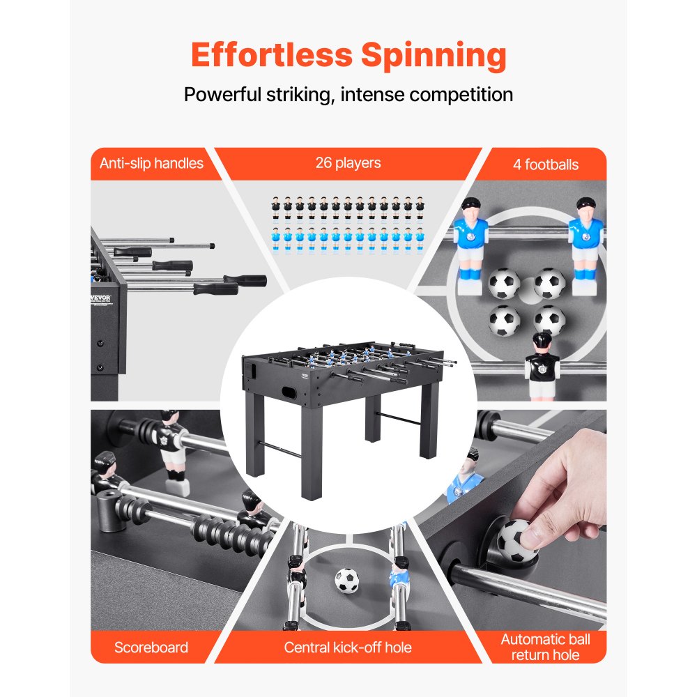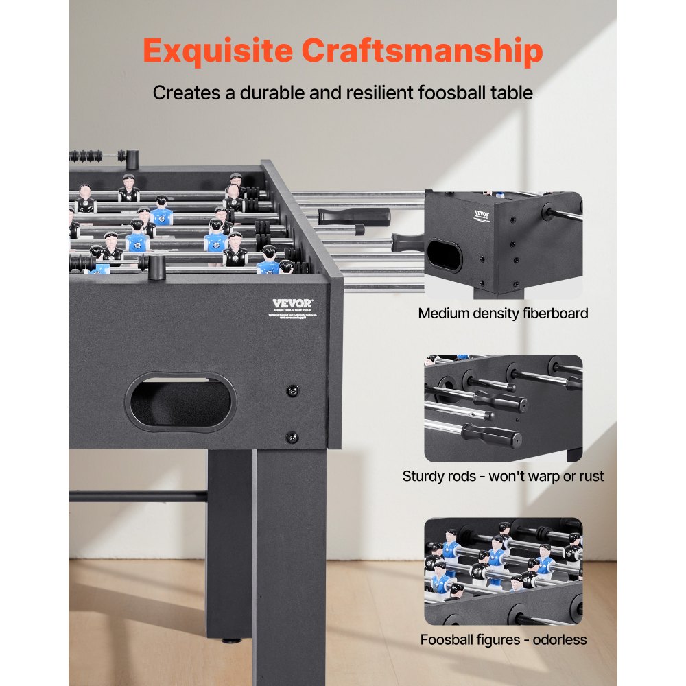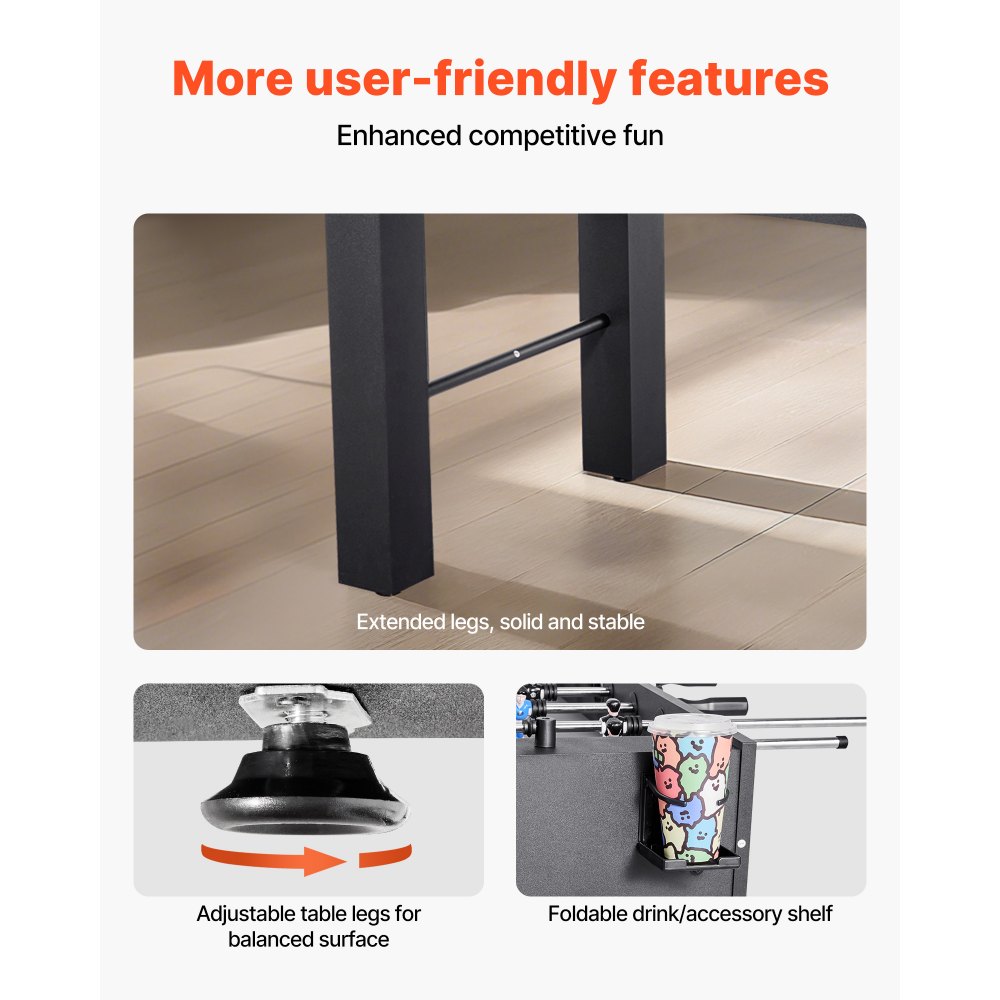 Ανθεκτικό και Στιβαρό: Το τραπέζι ποδοσφαιράκι 55 ιντσών είναι κατασκευασμένο από ανθεκτική ινοσανίδα μέσης πυκνότητας. Διαθέτει 26 παίκτες και 4 μπάλες ποδοσφαίρου. Οι ράβδοι είναι ίσιες και λείες, εξασφαλίζοντας δυνατά χτυπήματα χωρίς να λυγίζουν ή να σκουριάζουν. Εξαιρετική εμπειρία ψυχαγωγίας: Το τραπέζι του ποδοσφαιράκι διαθέτει αντιολισθητικές λαβές για ομαλή περιστροφή. Αυτό βοηθά στην γρήγορη εναλλαγή μεταξύ επίθεσης και άμυνας. Μπορείτε να κρατάτε το σκορ με τον σταθερό σημειωτή και να τοποθετείτε ένα νόστιμο ρόφημα στην ποτηροθήκη. Ομαλή κίνηση της μπάλας: Το άνετο ύψος του τραπεζιού ποδοσφαιράκι είναι κατάλληλο για τους περισσότερους ανθρώπους. Τα εκτεταμένα πόδια εξασφαλίζουν τη σταθερότητα του τραπεζιού και μπορείτε να τα ρυθμίσετε για να διατηρήσετε μια ισορροπημένη επιφάνεια παιχνιδιού για πιο ακριβή έλεγχο της μπάλας. Ευρεία εφαρμογή: Πρόκειται για ένα ευέλικτο τραπέζι για επαγγελματική ψυχαγωγία, αναψυχή στο σπίτι και εκπαιδευτικούς σκοπούς. Μπορεί να τοποθετηθεί στο σπίτι ή στο γραφείο και βρίσκεται συχνά σε κλαμπ αναψυχής, ξενώνες και μπαρ. Εύκολη συναρμολόγηση: Μπορείτε εύκολα να συναρμολογήσετε το τραπέζι του ποδοσφαιράκι ακολουθώντας τις οδηγίες μας. Αυτό το τραπέζι σχεδόν επαγγελματικού επιπέδου, με την στιβαρή συσκευασία του και τα πρακτικά χαρακτηριστικά του, αποτελεί μια εξαιρετική επιλογή δώρου για την οικογένεια και τους φίλους σας.