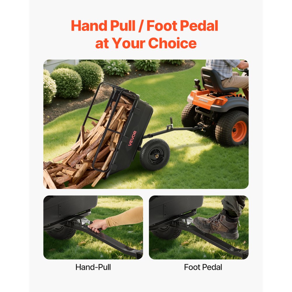 Συμβατότητα με όλους: Αυτό το τρέιλερ κήπου διαθέτει πείρο 0,47"/12 mm, συμβατό με διάφορα οχήματα, όπως τρακτέρ, ATV, UTV και χλοοκοπτικά. Συνδέεται εύκολα, προσφέροντας μια ιδανική λύση μεταφοράς για την ενίσχυση της αποδοτικότητας και τη μείωση του χρόνου λειτουργίας. Ανθεκτικό και στιβαρό: Το τρέιλερ αυλής με χωνί από χυτευμένο PP χωρίς ραφές προσθέτει πάχος και αποτρέπει τη σκουριά και τις ζημιές, εξασφαλίζοντας μακροχρόνια ανθεκτικότητα. Αντέχει στην έκθεση στον ήλιο και την υγρασία, καθαρίζεται εύκολα και αποτρέπει τη συσσώρευση βρωμιάς, μειώνοντας τις ανάγκες συντήρησης. Χωρητικότητα 250 κιλών: Με χωρητικότητα βάρους 250 κιλών και 10 κυβικά πόδια χώρου, αυτό το βοηθητικό τρέιλερ για χλοοκοπτική μηχανή χειρίζεται εύκολα τα απορρίμματα κήπου και τα βαριά αντικείμενα όπως χώμα, κλαδιά και λίπασμα. Ο σχεδιασμός του τριπλού προστατευτικού κιγκλιδώματος ενισχύει τον χώρο αποθήκευσης, μειώνοντας την ανάγκη για πολλαπλές μετακινήσεις και βελτιώνοντας την απόδοση. Χειρισμός με το χέρι ή το πόδι: Εξοπλισμένο με επιλογές χειροκίνητης έλξης και εκφόρτωσης με ποδοκίνητο ... Προσαρμόσιμο σε ανώμαλο έδαφος: Το τρέιλερ ATV διαθέτει μεγάλα πνευματικά ελαστικά 16"×4" που παρέχουν εξαιρετική πρόσφυση και αντοχή, εξασφαλίζοντας ομαλή κίνηση σε ανώμαλες επιφάνειες όπως γρασίδι, λάσπη, άμμο και χαλίκι. Τα φουσκωτά ελαστικά, σε συνδυασμό με έναν ενισχυμένο άξονα με ηλεκτροστατική βαφή πούδρας, προσφέρουν ανθεκτικότητα και αξιόπιστη απόδοση σε σύνθετα εδάφη.
