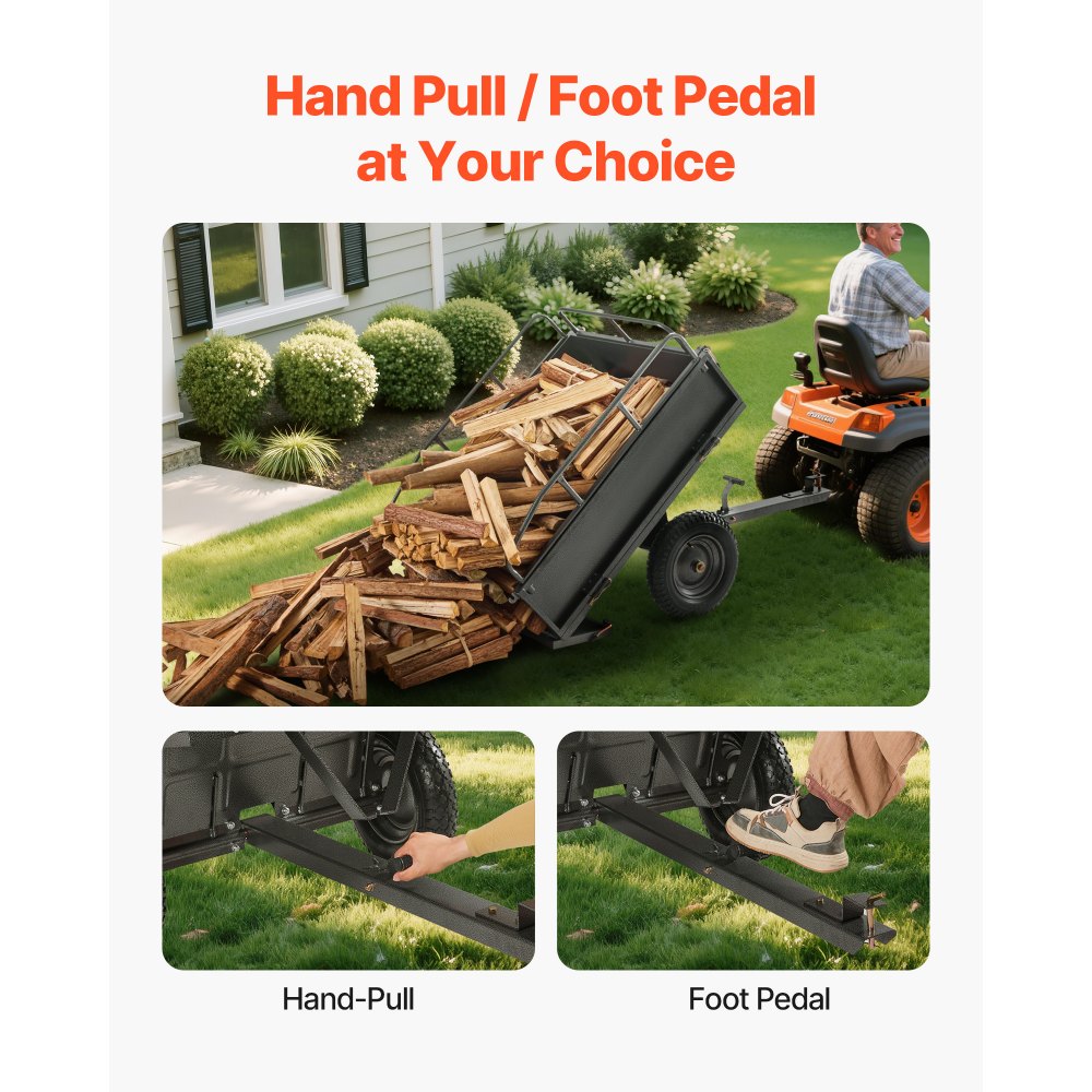 Καθολική συμβατότητα: Διαθέτοντας πείρο 0,47"/12 mm, αυτό το τρέιλερ κήπου είναι συμβατό με διάφορα μηχανήματα, όπως τρακτέρ, ATV, UTV και χλοοκοπτικά. Συνδέεται εύκολα, παρέχοντας μια ιδανική λύση μεταφοράς για την ενίσχυση της αποδοτικότητας και τη μείωση του χρόνου λειτουργίας. Στιβαρή κατασκευή: Σε αντίθεση με τα περισσότερα τρέιλερ αυλής, αυτό διαθέτει πλευρικά πάνελ πάχους 1 mm και ενισχυμένες νευρώσεις για πρόσθετη αντοχή. Το κάτω μέρος υποστηρίζεται από 8 ενισχυτικές νευρώσεις, βελτιώνοντας τη συνολική ικανότητα φορτίου και αποτρέποντας την παραμόρφωση. Το αναβαθμισμένο φινίρισμα βαφής σε απόχρωση σφυριού εξασφαλίζει καλύτερη πρόσφυση και ανθεκτικότητα. Αποδοτικός Βοηθός Μεταφοράς: Με χωρητικότητα βάρους 250 κιλών και χώρο 10 κυβικά πόδια, αυτό το τρέιλερ ATV χειρίζεται εύκολα τα απόβλητα κήπου και τα βαριά υλικά όπως χώμα, κλαδιά και λίπασμα. Ο σχεδιασμός του τριπλού προστατευτικού κιγκλιδώματος ενισχύει τον χώρο αποθήκευσης, μειώνοντας τα πολλαπλά ταξίδια και βελτιώνοντας την αποδοτικότητα της εργασίας. Χειρισμός με το χέρι ή το πόδι: Εξοπλισμένο με λειτουργίες τραβήγματος με το χέρι και εκφόρτωσης με πεντάλ, οι χρήστες μπορούν να επιλέξουν την πιο βολική επιλογή. Το τράβηγμα με το χέρι είναι ιδανικό για ακριβή εκφόρτωση, ενώ το πεντάλ είναι ιδανικό για γρήγορη εκφόρτωση μεγάλου όγκου, εξοικονομώντας χρόνο και ενέργεια. Προσαρμόσιμο σε ανώμαλο έδαφος: Με μεγάλα πνευματικά ελαστικά 14"×3,5", αυτό το τρέιλερ πολλαπλών χρήσεων για χλοοκοπτική μηχανή προσφέρει εξαιρετική πρόσφυση και αντοχή. Εξασφαλίζει ομαλή κίνηση σε ανώμαλες επιφάνειες όπως γρασίδι, λάσπη, άμμο και χαλίκι, με έναν παχύ άξονα με ηλεκτροστατική βαφή για ανθεκτικότητα.