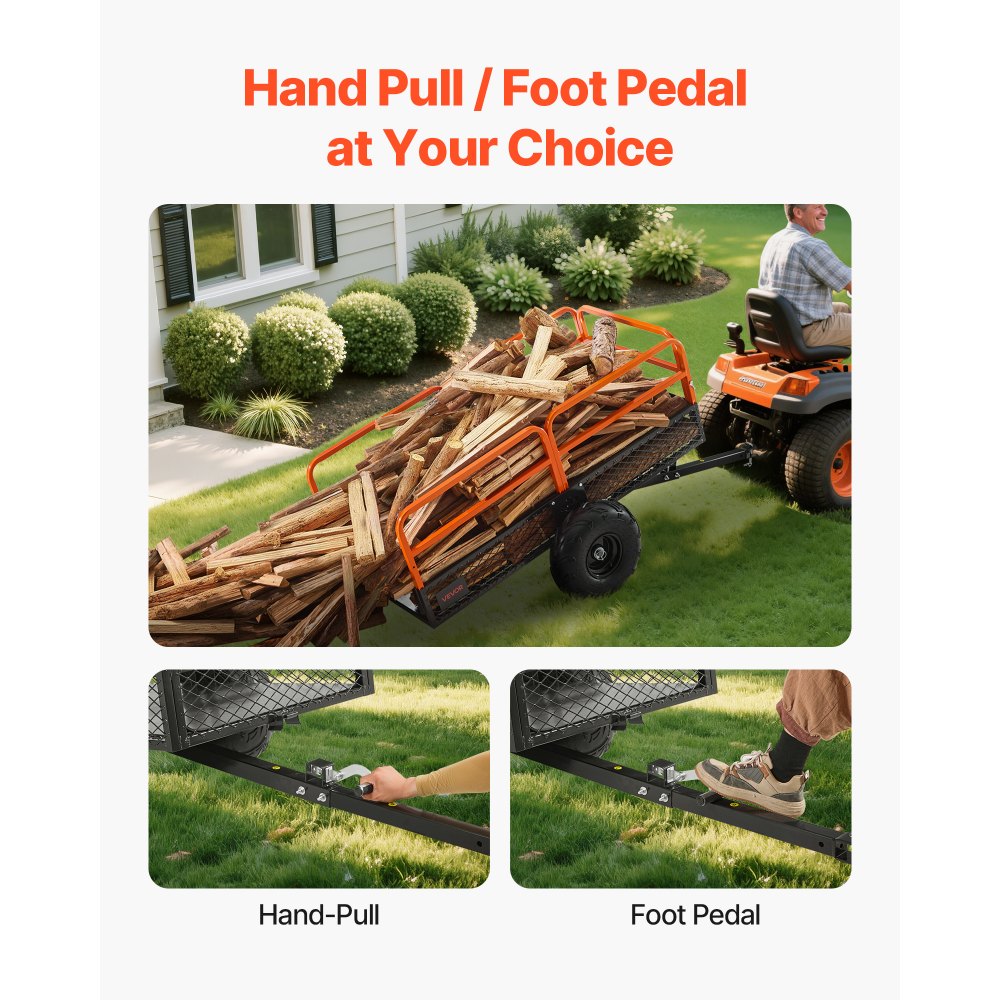 Καθολική συμβατότητα: Με έναν πείρο 0,47"/12 mm και δύο οπές για πείρο, αυτό το τρέιλερ ATV συνδέεται εύκολα με τρακτέρ, ATV, UTV και χλοοκοπτικά, προσφέροντας μια ιδανική λύση μεταφοράς για την ενίσχυση της αποδοτικότητας και τη μείωση του χρόνου λειτουργίας. Αποδοτικός Βοηθός Μεταφοράς: Αυτό το τρέιλερ αυλής μεταφέρει έως και 1.600 λίβρες. Ο ενισχυμένος κοτσαδόρος και τα πλευρικά κιγκλιδώματα ενισχύουν τη χωρητικότητα βάρους και αποτρέπουν την παραμόρφωση, εξασφαλίζοντας ανθεκτικότητα κατά τη διάρκεια βαρέων εργασιών. Ρυμουλκούμενο μεγάλης χωρητικότητας: Το ρυμουλκούμενο πολλαπλών χρήσεων χωράει 22 κυβικά πόδια απορριμμάτων αυλής, επιτρέποντάς σας να συλλέγετε περισσότερα ξύλα, χώμα και μπάζα ταυτόχρονα χωρίς συχνή απόρριψη, κάνοντας την εργασία στην αυλή ταχύτερη και ευκολότερη. Χειρισμός με το χέρι ή με το πόδι: Επιλέξτε ανάμεσα σε χειροκίνητο τράβηγμα ή εκκένωση με πεντάλ. Το χειροκίνητο τράβηγμα είναι για ακριβείς εργασίες, ενώ το πεντάλ είναι ιδανικό για γρήγορη, μαζική εκκένωση, μειώνοντας την καταπόνηση και βελτιώνοντας την απόδοση. Προσαρμόσιμο σε ανώμαλο έδαφος: Με ελαστικά πεπιεσμένου αέρα 16"×8", το τρέιλερ ATV παρέχει εξαιρετική πρόσφυση σε γρασίδι, λάσπη και χαλίκι. Σε συνδυασμό με έναν ενισχυμένο άξονα, το τρέιλερ κήπου εξασφαλίζει ομαλή λειτουργία σε ανώμαλες επιφάνειες, προσφέροντας ανθεκτικότητα και μακροχρόνια απόδοση.