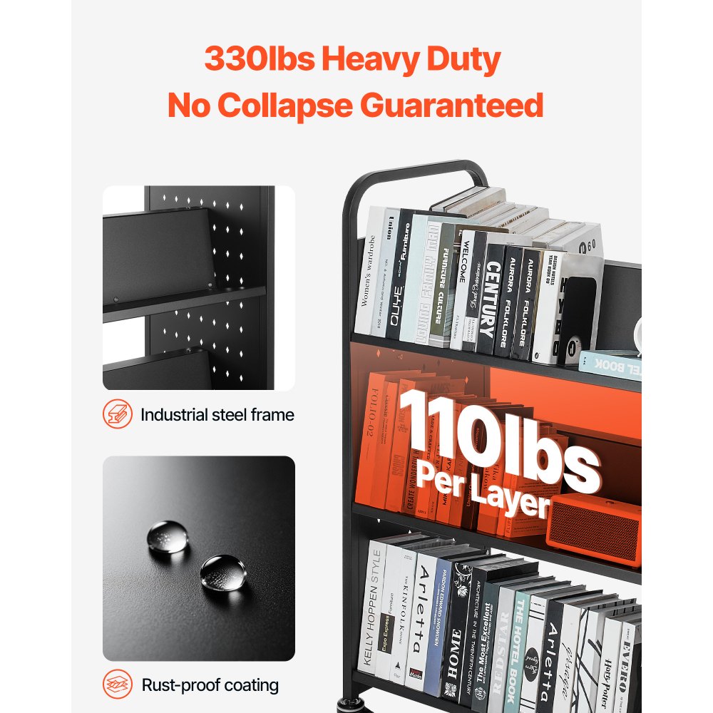Εξαιρετικά μεγάλη χωρητικότητα: Αυτό το καρότσι βιβλίων 3 επιπέδων με ράφια ύψους 14,14 ιντσών χωράει πολλά βιβλία ή είδη γραφείου! Είναι επίσης εξοπλισμένο με πλαϊνά διαμερίσματα για φακέλους/tablets A4—ιδανικά για βιβλιοθήκες, οικιακή χρήση και πολλά άλλα. Σταθερή αντοχή σε φορτίο: Κατασκευασμένο από ανθρακούχο χάλυβα υψηλής αντοχής, κάθε στρώμα του κυλιόμενου καροτσιού βιβλίων υποστηρίζει βάρος 50 κιλών, με συνολική χωρητικότητα 150 κιλών. Η επίστρωση που είναι ανθεκτική στη σκουριά εξασφαλίζει ανθεκτικότητα, ιδανική για βαριά βιβλία ή εξοπλισμό. Αθόρυβη κίνηση: Οι αθόρυβες περιστρεφόμενες ρόδες TPR γλιστρούν ομαλά και δύο διαθέτουν λειτουργία κλειδώματος για ασφαλή τοποθέτηση. Μετακινήστε το βιβλιοθηκάριο χωρίς κόπο πάνω σε ξύλινα ή πλακάκια δαπέδου χωρίς να ενοχλείτε κανέναν - ιδανικό για βιβλιοθήκες ή χρήση τη νύχτα. Γρήγορη εγκατάσταση: Δεν χρειάζονται πολύπλοκα εργαλεία! Το καρότσι βιβλίων της βιβλιοθήκης συναρμολογείται εύκολα με προ-τρυπημένες τρύπες, ώστε να είναι έτοιμο σε χρόνο μηδέν. Περιλαμβάνει οδηγό εγκατάστασης και επιπλέον βίδες για την ευκολία σας. Ευέλικτη χρήση: Ιδανικό για τον ανεφοδιασμό βιβλιοθήκης, τη μεταφορά σχολικών ειδών, τη διανομή εγγράφων γραφείου ή την οργάνωση βιβλίων και αντικειμένων στο σπίτι. Αυτό το κυλιόμενο ράφι βιβλίων είναι η ιδανική λύση για τις ανάγκες της εργασίας και του σπιτιού.