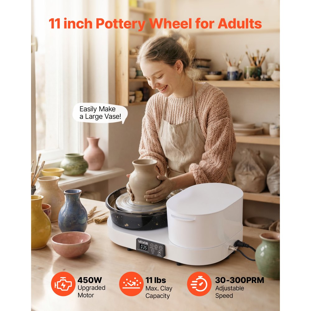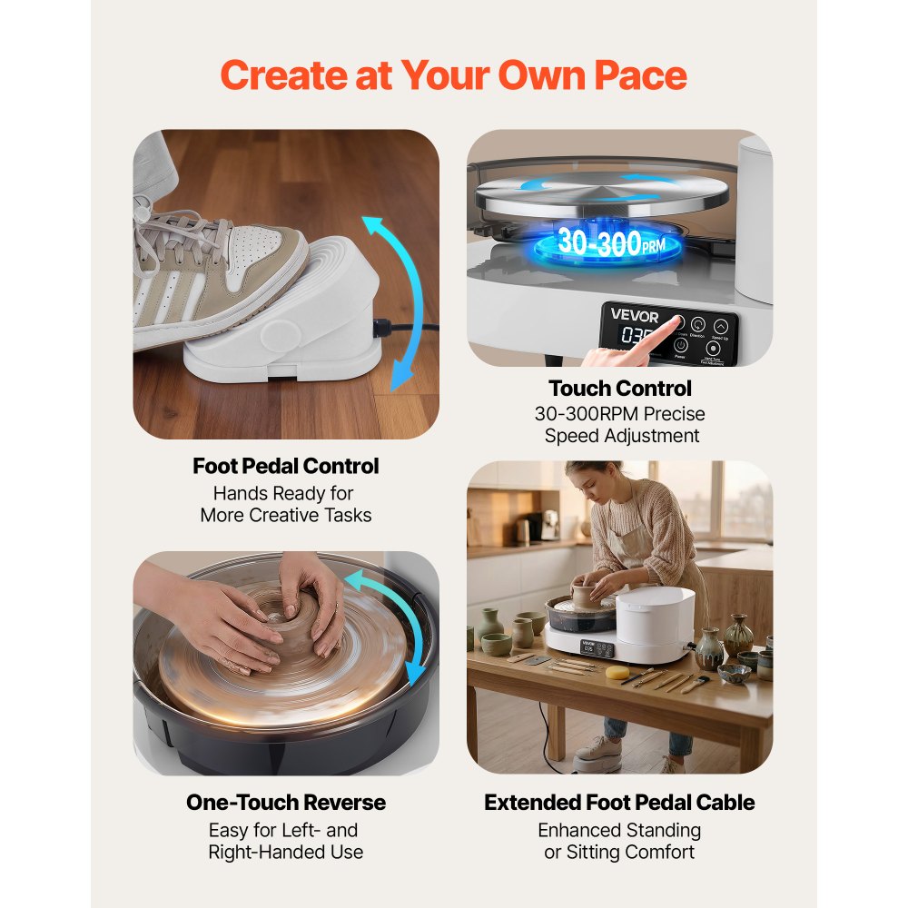 Τροχός κεραμικής VEVOR για ενήλικες, περιστρεφόμενος δίσκος αλουμινίου 28 cm, ηλεκτρικός επιτραπέζιος τροχός κεραμικής 450W με πεντάλ ποδιού, ρυθμιζόμενη ταχύτητα 30-300 σ.α.λ., σώμα αλουμινίου, για αρχάριους, χειροτεχνία από πηλό DIY, λευκό