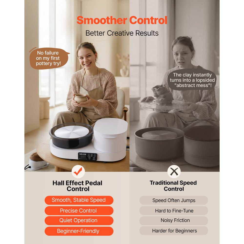 Ευρύχωρος & Ανθεκτικός Χώρος Εργασίας: Ιδανικός για αρχάριους που στοχεύουν ψηλά, αυτός ο τροχός κεραμικής διαθέτει περιστρεφόμενο δίσκο 11" για άφθονο χώρο διαμόρφωσης. Ο κινητήρας 450W παρέχει σταθερή ισχύ, χειριζόμενος έως και 11 λίβρες πηλού για ομαλά, επαγγελματικής ποιότητας αποτελέσματα. Σχεδιασμός που εξοικονομεί χώρο: Κατασκευασμένος για να αξιοποιήσει στο έπακρο τη δημιουργικότητά σας, αυτός ο τροχός κεραμικής για ενήλικες διαθέτει μια καινοτόμο επιφάνεια που είναι 50% μικρότερη από τα παραδοσιακά μοντέλα, συμβάλλοντας στην εξοικονόμηση πολύτιμου εσωτερικού χώρου. Είναι εύκολος στη μεταφορά και την αποθήκευση οπουδήποτε. Ενσωματωμένη αποθήκευση εργαλείων: Ο ηλεκτρικός τροχός κεραμικής μας σας κρατά συγκεντρωμένους στην τέχνη σας. Το πολυλειτουργικό κουτί στη δεξιά πλευρά διατηρεί το νερό, τα εργαλεία κλαδέματος και τα απαραίτητα σε κοντινή απόσταση, μειώνοντας την ακαταστασία για μια ομαλή και αδιάκοπη δημιουργική ροή εργασίας. Πεντάλ ποδιού με άμεση απόκριση: Το προηγμένο πεντάλ εφέ Hall του κεραμικού τροχού παρέχει απίστευτα ομαλή επιτάχυνση και επιβράδυνση χωρίς καθυστέρηση από 30-300 σ.α.λ., μεταφράζοντας τις ανεπαίσθητες κινήσεις των ποδιών σας σε ακριβή έλεγχο για λεπτομερή καλλιτεχνική έκφραση. Ιδανικό Δώρο: Αυτός ο τροχός κεραμικής περιλαμβάνει ένα σετ εργαλείων 8 τεμαχίων από ανοξείδωτο ατσάλι, ένα σετ εργαλείων 8 τεμαχίων από ξύλο και μια ποδιά - όλα όσα χρειάζεται ένας αρχάριος. Αποτελεί ένα προσεγμένο δώρο για ζευγάρια, οικογένειες και φίλους, ιδανικό για να κάνετε έκπληξη στα αγαπημένα σας πρόσωπα.