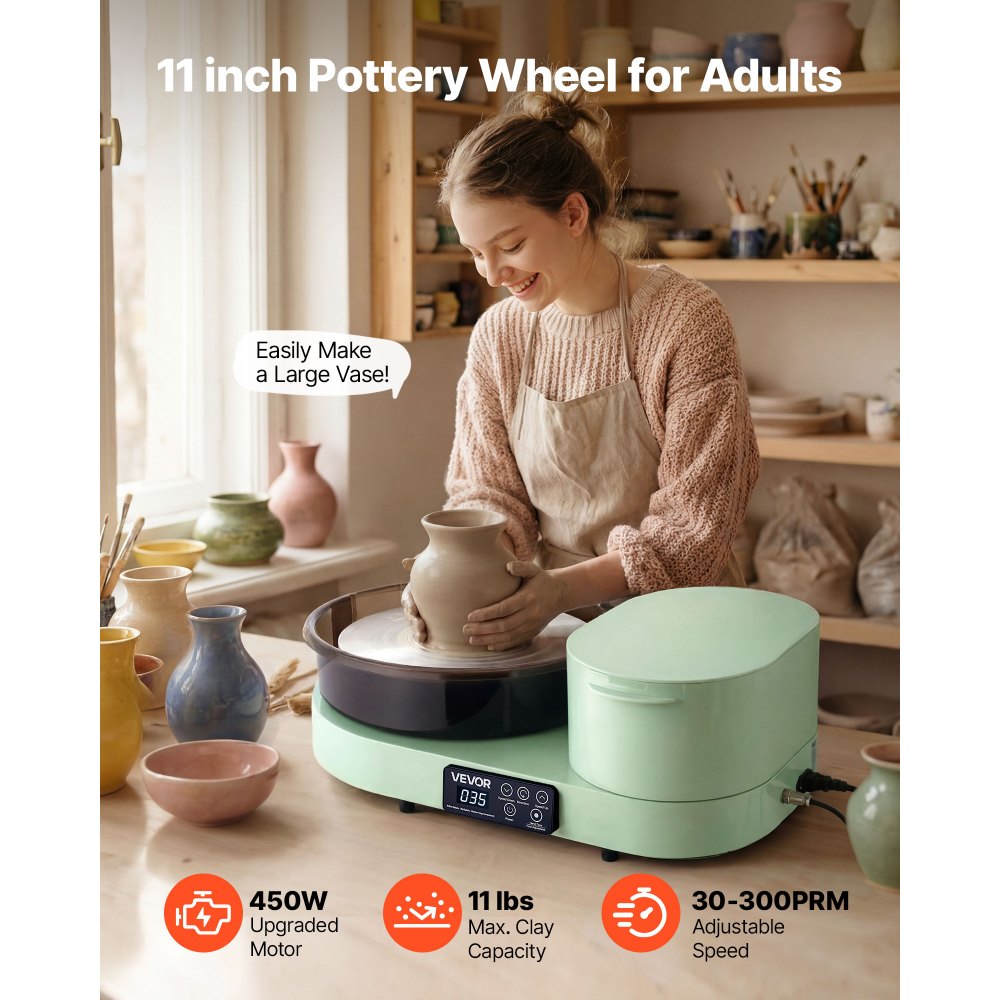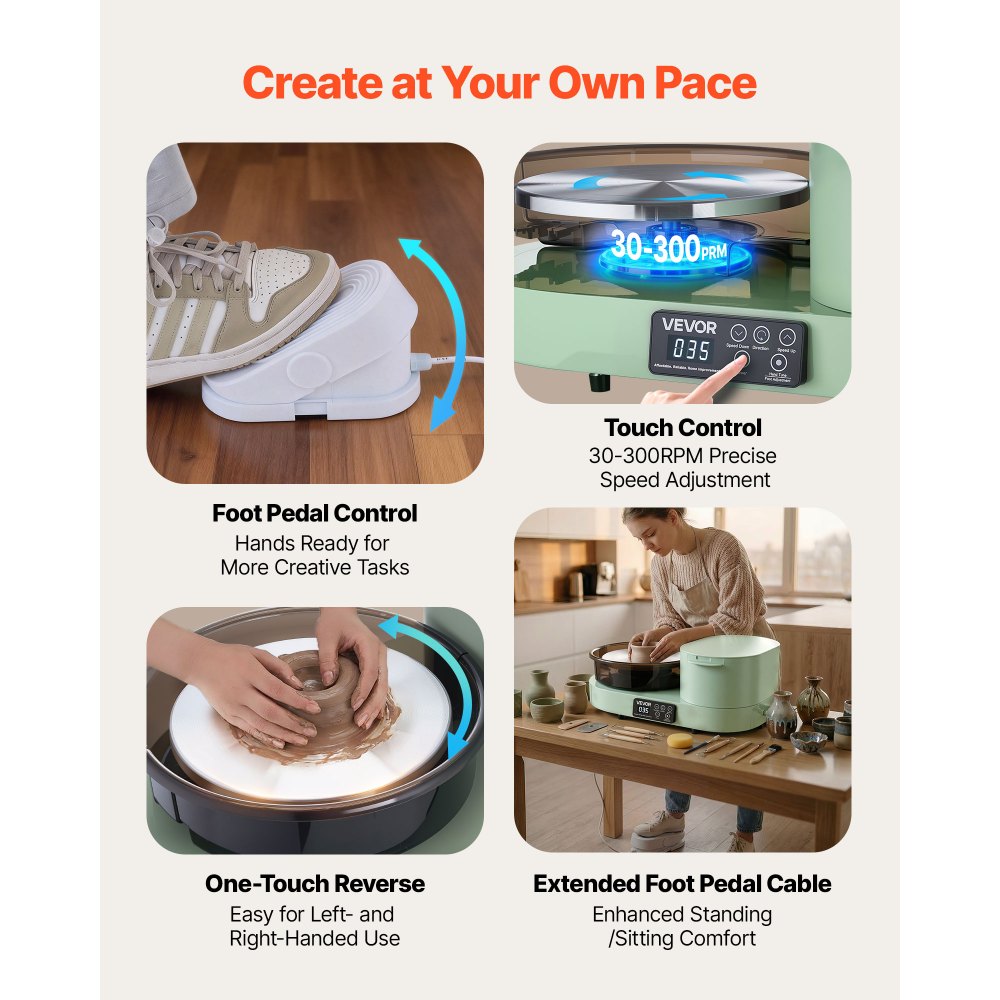 Ευρύχωρος & Ανθεκτικός Χώρος Εργασίας: Ιδανικός για αρχάριους που στοχεύουν ψηλά, αυτός ο τροχός κεραμικής διαθέτει περιστρεφόμενο δίσκο 11" για άφθονο χώρο διαμόρφωσης. Ο κινητήρας 450W παρέχει σταθερή ισχύ, χειριζόμενος έως και 11 λίβρες πηλού για ομαλά, επαγγελματικής ποιότητας αποτελέσματα. Σχεδιασμός που εξοικονομεί χώρο: Κατασκευασμένος για να αξιοποιήσει στο έπακρο τη δημιουργικότητά σας, αυτός ο τροχός κεραμικής για ενήλικες διαθέτει μια καινοτόμο επιφάνεια που είναι 50% μικρότερη από τα παραδοσιακά μοντέλα, συμβάλλοντας στην εξοικονόμηση πολύτιμου εσωτερικού χώρου. Είναι εύκολος στη μεταφορά και την αποθήκευση οπουδήποτε. Ενσωματωμένη αποθήκευση εργαλείων: Ο ηλεκτρικός τροχός κεραμικής μας σας κρατά συγκεντρωμένους στην τέχνη σας. Το πολυλειτουργικό κουτί στη δεξιά πλευρά διατηρεί το νερό, τα εργαλεία κλαδέματος και τα απαραίτητα σε κοντινή απόσταση, μειώνοντας την ακαταστασία για μια ομαλή και αδιάκοπη δημιουργική ροή εργασίας. Πεντάλ ποδιού με άμεση απόκριση: Το προηγμένο πεντάλ εφέ Hall του κεραμικού τροχού παρέχει απίστευτα ομαλή επιτάχυνση και επιβράδυνση χωρίς καθυστέρηση από 30-300 σ.α.λ., μεταφράζοντας τις ανεπαίσθητες κινήσεις των ποδιών σας σε ακριβή έλεγχο για λεπτομερή καλλιτεχνική έκφραση. Ιδανικό Δώρο: Αυτός ο τροχός κεραμικής περιλαμβάνει ένα σετ εργαλείων 8 τεμαχίων από ανοξείδωτο ατσάλι, ένα σετ εργαλείων 8 τεμαχίων από ξύλο και μια ποδιά - όλα όσα χρειάζεται ένας αρχάριος. Αποτελεί ένα προσεγμένο δώρο για ζευγάρια, οικογένειες και φίλους, ιδανικό για να κάνετε έκπληξη στα αγαπημένα σας πρόσωπα.