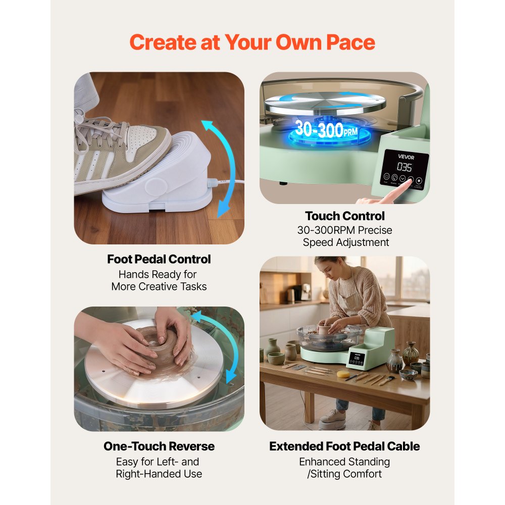 Ευρύχωρος & Ανθεκτικός Χώρος Εργασίας: Ιδανικός για αρχάριους που στοχεύουν ψηλά, αυτός ο τροχός κεραμικής διαθέτει περιστρεφόμενες πλάκες 11" και 14" για άφθονο χώρο διαμόρφωσης. Ο κινητήρας 450W παρέχει σταθερή ισχύ, χειριζόμενος έως και 11 λίβρες πηλού για ομαλά, επαγγελματικά αποτελέσματα. Σχεδιασμός που εξοικονομεί χώρο: Κατασκευασμένος για να αξιοποιήσει στο έπακρο τη δημιουργικότητά σας, αυτός ο τροχός κεραμικής για ενήλικες διαθέτει μια καινοτόμο επιφάνεια που είναι 50% μικρότερη από τα παραδοσιακά μοντέλα, συμβάλλοντας στην εξοικονόμηση πολύτιμου εσωτερικού χώρου. Είναι εύκολος στη μεταφορά και την αποθήκευση οπουδήποτε. Ενσωματωμένη αποθήκευση εργαλείων: Ο ηλεκτρικός τροχός κεραμικής μας σας κρατά συγκεντρωμένους στην τέχνη σας. Το κουτί αποθήκευσης διπλής στρώσης στη δεξιά πλευρά διατηρεί τα εργαλεία κοπής, τα χρώματα και τα απαραίτητα σε κοντινή απόσταση, μειώνοντας την ακαταστασία για μια ομαλή και αδιάλειπτη δημιουργική ροή εργασίας. Πεντάλ ποδιού με άμεση απόκριση: Το προηγμένο πεντάλ εφέ Hall του κεραμικού τροχού παρέχει απίστευτα ομαλή επιτάχυνση και επιβράδυνση χωρίς καθυστέρηση από 30-300 σ.α.λ., μεταφράζοντας τις ανεπαίσθητες κινήσεις των ποδιών σας σε ακριβή έλεγχο για λεπτομερή καλλιτεχνική έκφραση. Ιδανικό Δώρο: Αυτός ο τροχός κεραμικής περιλαμβάνει ένα σετ εργαλείων 8 τεμαχίων από ανοξείδωτο ατσάλι, ένα σετ εργαλείων 8 τεμαχίων από ξύλο και μια ποδιά - όλα όσα χρειάζεται ένας αρχάριος. Αποτελεί ένα προσεγμένο δώρο για ζευγάρια, οικογένειες και φίλους, ιδανικό για να κάνετε έκπληξη στα αγαπημένα σας πρόσωπα.