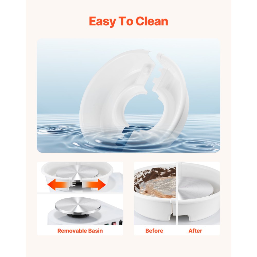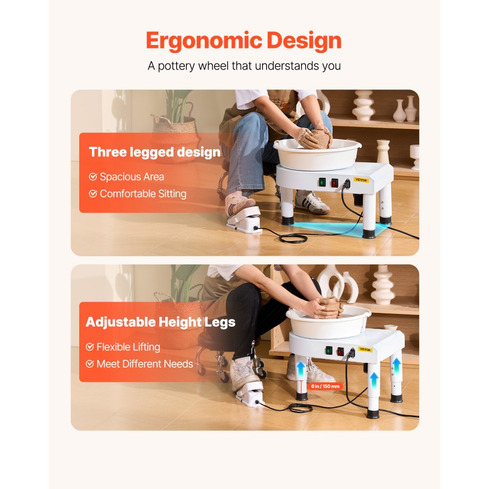 Κορυφαία ποιότητα: Το μεγάλο πικάπ από κράμα αλουμινίου 28 cm επιτρέπει στους χρήστες να σχεδιάζουν γρήγορα μεγάλα κομμάτια. Η ανθεκτική λεκάνη νερού ABS αποτρέπει το πιτσίλισμα λάσπης και είναι αποσπώμενη για εύκολο καθάρισμα. Η συμπαγής κατασκευή με τον εξανθρωπισμένο σχεδιασμό και τις εξαιρετικές λεπτομέρειες προσφέρει στους χρήστες μια πιο ευχάριστη εμπειρία. Απολαύστε την αγγειοπλαστική και τη γλυπτική από την άνεση του σπιτιού σας. Ευέλικτος σχεδιασμός ανυψούμενης επιφάνειας: Αυτή η αναβαθμισμένη έκδοση της ανθεκτικής βάσης επιτρέπει την εύκολη ανύψωση ή το κατέβασμα της επιφάνειας του τραπεζιού σε εύρος 0 - 6 ιντσών / 0 - 150 mm, γεγονός που προσφέρει άνεση σε χρήστες όλων των υψών. Επιπλέον, η τριγωνική δομή διασφαλίζει ότι το μηχάνημα δεν κουνιέται κατά τη λειτουργία. Λειτουργήστε σταθερά και ελέγξτε τη μορφή του αντικειμένου σας. Ανεξάρτητο πεντάλ ποδιού: Τα αδιάβροχα κουμπιά του πίνακα σάς βοηθούν να ελέγχετε την κατεύθυνση του τροχού απλώς αγγίζοντας το κουμπί στην οθόνη. Συνδυάζοντας έναν κινητήρα χωρίς ψήκτρες 350W, το ανθεκτικό πεντάλ ποδιού μπορεί να επιτύχει ταχύτητα 60-300 σ.α.λ. με χαμηλό θόρυβο 60dB. Μπορεί να περιστραφεί δεξιόστροφα ή αριστερόστροφα για να καλύψει διαφορετικές ανάγκες. Προστασία ασφαλείας: Μονοφασική τρισύρματη σύνδεση με συσκευή προστασίας από διαρροές γείωσης που χρησιμοποιείται για ασφαλή και αξιόπιστη λειτουργία. Επιπλέον, τα ενισχυμένα μαξιλαράκια στο κάτω μέρος του μηχανήματος προσφέρουν σταθερότητα και μειώνουν τις γρατσουνιές στο πάτωμα. Με ικανοποίηση χρήστη και μεγάλη διάρκεια ζωής του προϊόντος, μπορείτε να επικεντρωθείτε στην εργασία σας και να δημιουργήσετε κάτι εμπνευσμένο. Περιλαμβάνονται πλήρη εργαλεία γλυπτικής: Αυτός ο τροχός κεραμικής περιλαμβάνει 8 εργαλεία από ανοξείδωτο ατσάλι και 8 ξύλινα εργαλεία, για να σας βοηθήσει να δημιουργήσετε τα πιάτα, τα βάζα και τα κεραμικά σας έργα τέχνης χωρίς κόπο. Κατάλληλο για σχολική διδασκαλία, μπαρ κεραμικής, οικιακή χρήση κ.λπ. Υποστηρίζει τη διαδικασία ρίψης και διαμόρφωσης που ανταποκρίνεται στις απαιτήσεις των πιο επαγγελματιών κεραμιστών και ερασιτεχνών λάτρεις.