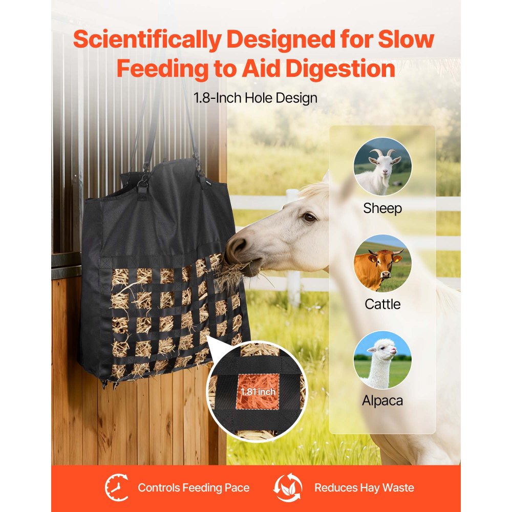 Σχεδιασμός γρήγορης πλήρωσης: Με διαστάσεις 21,65 x 7,28 x 25,2 ίντσες, αυτή η σακούλα αργής τροφοδοσίας χωράει περίπου 2-3 μπάλες (12-30 λίβρες) σανού timothy, οπωρώνα ή μηδικής. Το ευρύ άνοιγμα επιτρέπει γρήγορο και εύκολο γέμισμα σε δευτερόλεπτα, εξασφαλίζοντας αποτελεσματική σίτιση για τα ζώα σας. Ανθεκτική κατασκευή: Κατασκευασμένη με ενισχυμένο νάιλον ιμάντα και ύφασμα Oxford με επικάλυψη PVC, αυτή η τσάντα σανού για άλογα παρέχει αντοχή στο σκίσιμο και την τριβή. Η στιβαρή επίστρωση αντιστέκεται στο ράγισμα ή το ξεφλούδισμα, διατηρώντας το σχήμα της με την πάροδο του χρόνου και αποτρέποντας την κατάποση υπολειμμάτων. Επιστημονική αργή τροφοδοσία: Με πάχος ματιού 1,81 ίντσας, αυτή η σακούλα με άχυρο αλόγου μιμείται τη φυσική βόσκηση, επιβραδύνει το φαγητό, αποφεύγει την υπερκατανάλωση τροφής και μειώνει τον κίνδυνο φουσκώματος ή ελκών, υποστηρίζοντας τη βέλτιστη πέψη για τα άλογα. Μείωση της σπατάλης τροφής: Το πλέγμα για τον σάκο σανού περιορίζει τις διαρροές και το πεσμένο σανό, διατηρώντας την τροφή φρέσκια και καθαρή. Ελαχιστοποιεί τη σπατάλη και εξοικονομεί κόστος, διατηρώντας παράλληλα έναν τακτοποιημένο και καθαρό χώρο σίτισης για τα άλογά σας. Ευρεία εφαρμογή: Αυτή η ταΐστρα αργής ροής για άλογα είναι ιδανική για στάβλους, μάντρες, εξωτερικούς χώρους εκπαίδευσης και σύντομες εκδρομές σίτισης. Είναι κατάλληλη για άλογα, κατσίκες, αλπακά και κουνέλια, καθιστώντας εύκολη την αποτελεσματική σίτιση πολλών ζώων.
