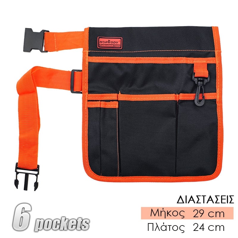Διαθέτει 1 μεγάλη θήκη, 3 μεσαίες και 2 μικρότερες μπροστά για κατσαβίδια, μολύβια κ.λπ.Υλικό κατασκευής: Συνθετικό υλικό Polyester Ανθεκτική κατασκευήΕργονομική One SizeΜέγεθος: max περίμετρος 110 cm