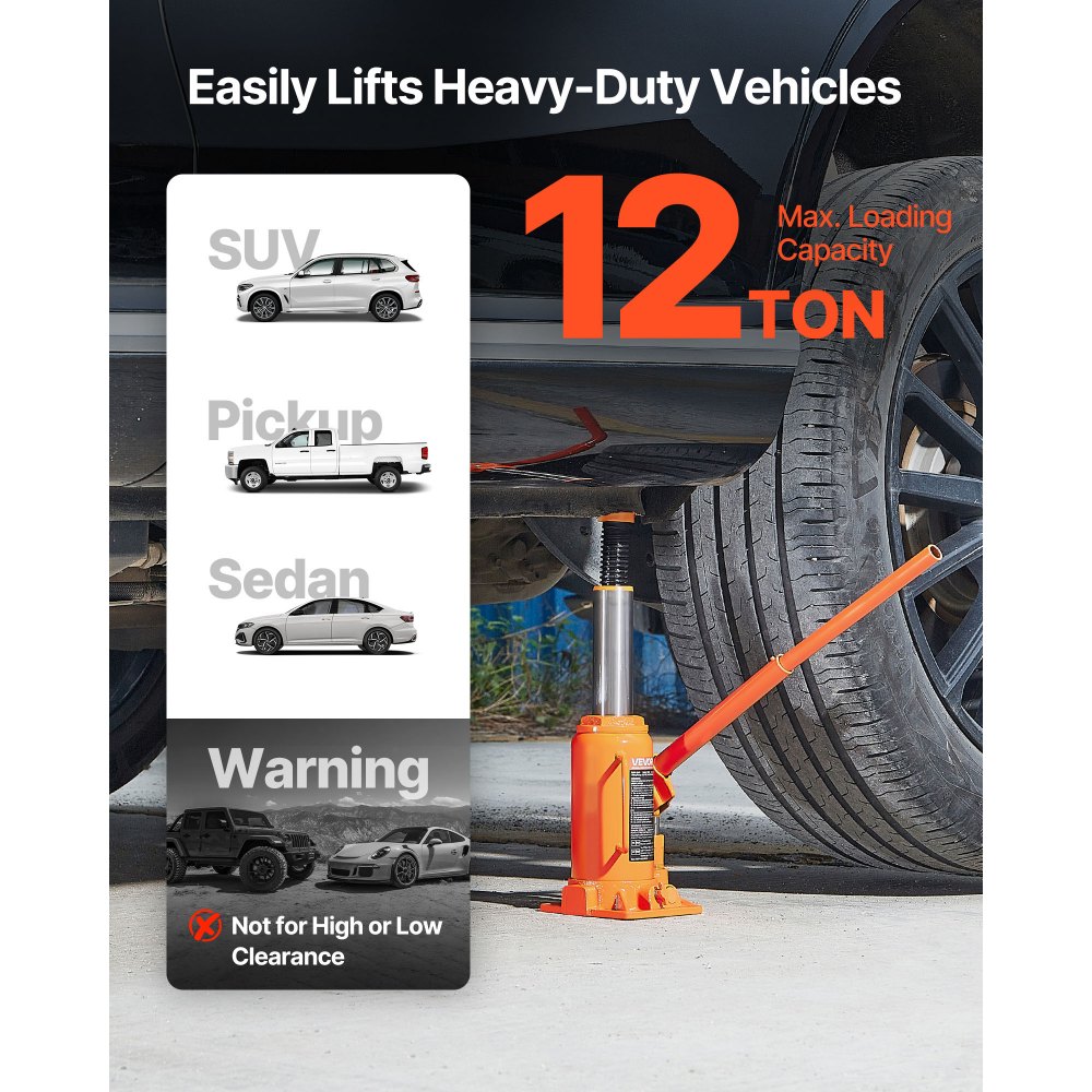 Σταθερή ανύψωση: Ο υδραυλικός γρύλος μπουκαλιών μας χειρίζεται έως και 12 τόνους (26.455,5 λίβρες), ιδανικός για sedan, pickup, SUV, μικρά ρυμουλκούμενα RV και minivan. Είναι ιδανικός για αλλαγές ελαστικών, γρήγορες επιθεωρήσεις, ακόμη και ανύψωση γεωργικού εξοπλισμού και μηχανημάτων κατασκευών. Ευρύ φάσμα ανύψωσης: Από χαμηλό έως υψηλό, αυτός ο γρύλος μπουκαλιών υψηλής ανύψωσης έχει το εύρος ανύψωσης. Ανυψώνει από 8,1 ίντσες (205 mm) έως 15,7 ίντσες (400 mm), με μια βίδα 2,4 ιντσών (60 mm) για λεπτή ρύθμιση του ύψους - βολικό όταν ο χώρος είναι περιορισμένος. Εύκολη λειτουργία: Δεν χρειάζεται να καταπονείστε με αυτόν τον γρύλο μπουκαλιών—χρησιμοποιήστε τη λαβή 2 τεμαχίων και την συρόμενη αντλία για να σηκώσετε το φορτίο σας. Είστε έτοιμοι να το κατεβάσετε; Γυρίστε αργά τη βαλβίδα αριστερόστροφα για ασφαλή κατάβαση. Χρησιμοποιείτε πάντα βάσεις γρύλου για να συγκρατείτε το βάρος μετά την ανύψωση. Ασφαλές & χωρίς διαρροές: Ο μικρός γρύλος φιάλης είναι κατασκευασμένος από ανθεκτικά υλικά με μια στιβαρή σέλα που παραμένει σταθερή. Η ενσωματωμένη βαλβίδα βοηθά στην αποφυγή υπερφορτώσεων και το συγκολλημένο σώμα με θύρα λαδιού με ελαστικό σφραγισμένο σημαίνει ότι δεν θα υπάρχουν ακατάστατες διαρροές με την πάροδο του χρόνου. Συμπαγής και φορητός: Συμπαγής και ελαφρύς, αυτός ο γρύλος βαρέως τύπου χωράει εύκολα στο πορτμπαγκάζ ή στο γκαράζ σας. Έτοιμο για εργασία οποιαδήποτε στιγμή, οπουδήποτε—δεν απαιτείται συμπιεστής ή ηλεκτρικό ρεύμα.