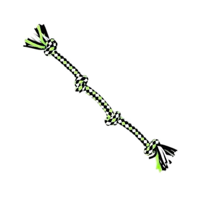 Παιχνίδι σκύλου σχοινί με κόμπους, από ελαστικό, ανθεκτικό, μη τοξικό πολυεστέρα, ιδανικό για παιχνίδια τραβήγματος/αντίστασης ενώ παράλληλα βοηθά στην υγιεινή στόματος του σκύλου σας καθώς καθαρίζει ήπια και απασχολεί τα δόντια του. Συνολικό μήκος: 42cm.