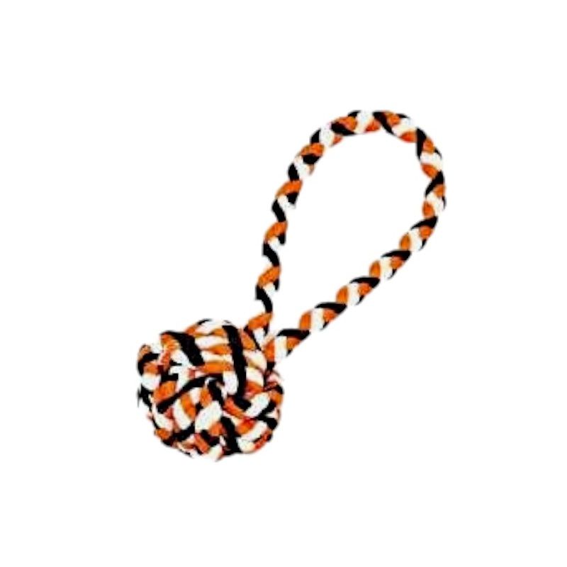 Παιχνίδι σκύλου πλεκτό σχοινί με μπάλα, κατασκευασμένο από ιδιαίτερα ανθεκτικό ελαστικό ύφασμα, μη τοξικό, ιδανικό για πολλαπλά είδη παιχνιδιού και άσκησης. Θα γίνει το αγαπημένο καθημερινό παιχνίδι που το σκυλί σας θα λατρέψει.