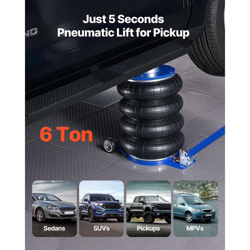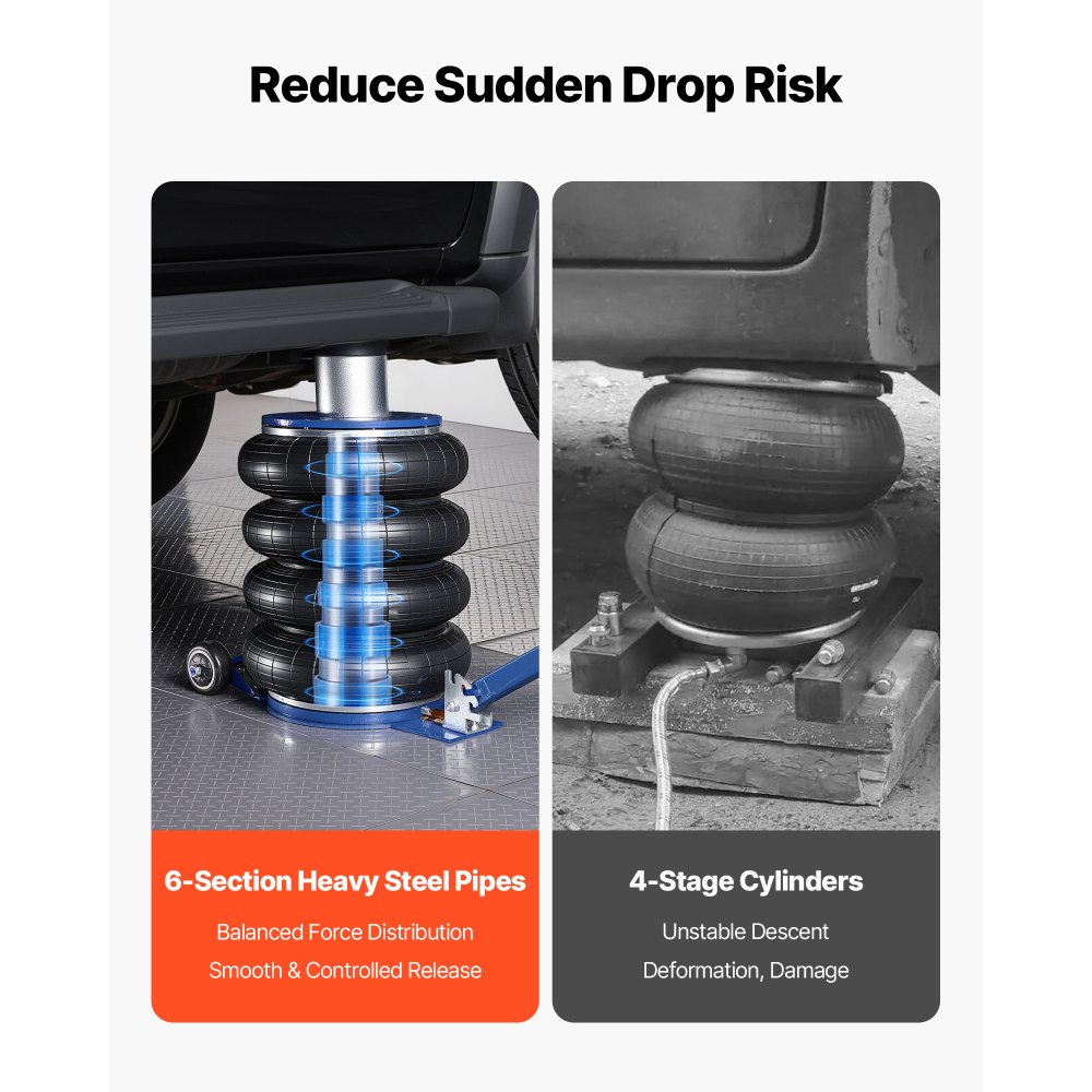 Ταιριάζει σε περισσότερα οχήματα: Αυτός ο γρύλος αέρα περιλαμβάνει μια επιπλέον κολόνα επέκτασης. Χωρίς την κολόνα, ανυψώνει 6,7-23 ίντσες (170-583 mm). με την κολόνα, 10,2-26,5 ίντσες (260-673 mm). Ένας γρύλος ταιριάζει τόσο σε αυτοκίνητα χαμηλού προφίλ όσο και σε SUV ή φορτηγάκια υψηλής απόστασης. Χωρητικότητα βαρέος φορτίου 6 τόνων: Αυτή η υποδοχή αερόσακου υποστηρίζει έως και 6 τόνους/13227 λίβρες, κατάλληλη για sedan, SUV, pickup και φορτηγά. Ο ενισχυμένος τετραστρωματικός αερόσακος και η διευρυμένη πλάκα βάσης εξασφαλίζουν ισχυρή και σταθερή απόδοση ανύψωσης. Ελεγχόμενη & Ασφαλής Κατάβαση: Η υποδοχή αερόσακου διαθέτει έξι βαρείς χαλύβδινους σωλήνες στο εσωτερικό, ο καθένας με μικρότερη διαδρομή για ομαλή, σταθερή κάθοδο και ακριβή έλεγχο ύψους. Σταματά τις απότομες πτώσεις, κατανέμει ομοιόμορφα το βάρος και αποφεύγει την παραμόρφωση ή την κλίση. Γρήγορη ανύψωση αέρα σε δευτερόλεπτα: Με ρυθμιζόμενη λαβή και ελαστικούς τροχούς, η υποδοχή αέρα αυτοκινήτου ευθυγραμμίζεται εύκολα κάτω από το αυτοκίνητό σας. Συνδέστε την σε έναν αεροσυμπιεστή και σηκώστε το αυτοκίνητό σας σε μόλις 2-5 δευτερόλεπτα - ιδανική για γρήγορη επισκευή αυτοκινήτου. Χρησιμοποιήστε τη με βάση γρύλου για μεγάλη στήριξη. Ασφαλής στήριξη οχήματος: Το πάνω μέρος του γρύλου ανύψωσης αέρα περιλαμβάνει ένα παχύ ελαστικό μαξιλαράκι που συγκρατεί σταθερά το σημείο επαφής του αυτοκινήτου για αντιολισθητική, ασφαλή στερέωση στο σασί. Η βαλβίδα διαθέτει συνδέσμους 1/4 ίντσας ΗΠΑ και ΕΕ, συμβατούς με αεροσυμπιεστές 0,8-1,0 MPa.