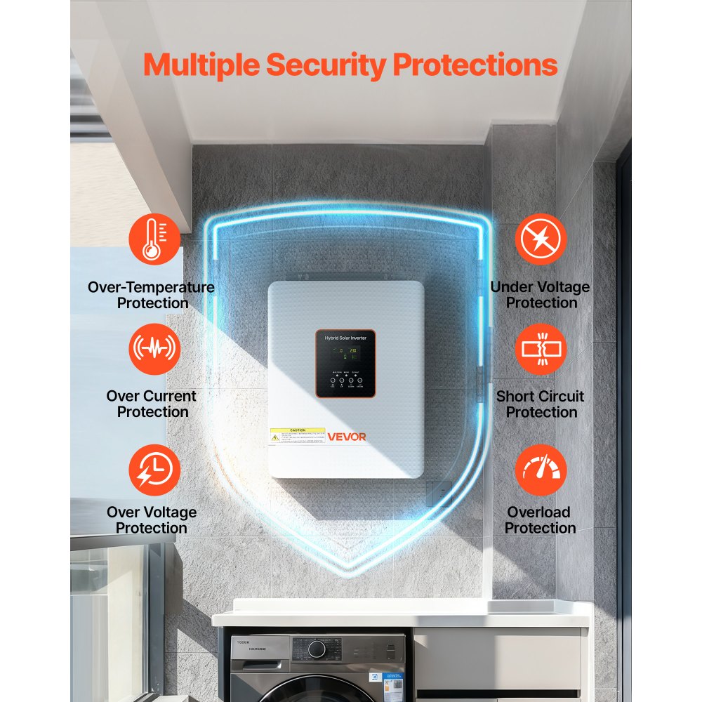 Υβριδικός Ηλιακός Μετατροπέας 2 σε 1: Ενσωματώνει άψογα τον μετατροπέα και τον ελεγκτή σε μία μονάδα. Παρέχει μονοφασική έξοδο καθαρού ημιτονοειδούς κύματος 3000W, 230V AC, καθιστώντας τον ιδανικό για μικρά σπίτια και ηλιακά συστήματα αυτόνομου δικτύου. Για συσκευές που απαιτούν άλλες τάσεις, απαιτείται μετασχηματιστής (δεν περιλαμβάνεται) Έξοδος καθαρού ημιτονοειδούς κύματος: Απολαύστε ηλεκτρικό ρεύμα ποιότητας κοινής ωφέλειας για τα ηλεκτρονικά ακριβείας σας που είναι ευαίσθητα στην τάση. Με έξοδο καθαρού ημιτονοειδούς κύματος, ο ηλιακός μετατροπέας μας εξασφαλίζει σταθερή και ασφαλή λειτουργία για διάφορες οικιακές συσκευές, όπως υπολογιστές και τηλεοράσεις. 99% Απόδοση Μετατροπής: Εξοπλισμένος με έναν προηγμένο ελεγκτή φόρτισης ηλιακής ενέργειας MPPT, αυτός ο υβριδικός φορτιστής μετατροπέα συλλέγει και μετατρέπει περισσότερη ηλιακή ενέργεια σε αξιοποιήσιμη ισχύ, αυξάνοντας σημαντικά την ημερήσια ενεργειακή σας απόδοση. Ευρεία συμβατότητα μπαταριών: Σχεδιασμένος για συστήματα μπαταριών 24V, αυτός ο υβριδικός μετατροπέας ηλιακής ενέργειας υποστηρίζει μπαταρίες λιθίου, μολύβδου-οξέος, ακόμη και προσαρμοσμένους τύπους μπαταριών. Παρέχει ευελιξία για την προτιμώμενη λύση αποθήκευσης. Ολοκληρωμένη προστασία: Περιλαμβάνει προστασία από υπερθέρμανση, υπερένταση, υπέρταση, υποτάση, βραχυκύκλωμα και υπερφόρτωση. Αυτός ο υβριδικός ηλιακός μετατροπέας εκτός δικτύου εξασφαλίζει ασφαλή λειτουργία για τα κυκλώματά σας και την παροχή ρεύματος.