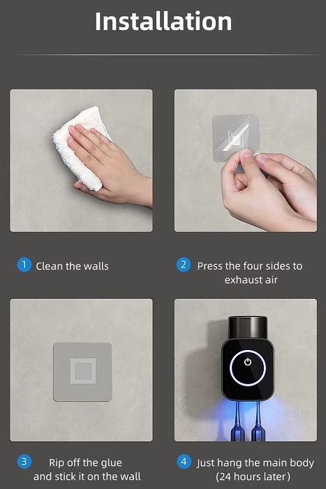 Τοποθετείται στον τοίχο, με ισχυρή αυτοκόλλητη βάση, με κρεμαστράκι πάνω στο οποίο μπορείτε να τοποθετείτε και να αφαιρείτε τον αποστειρωτή πολύ εύκολα.