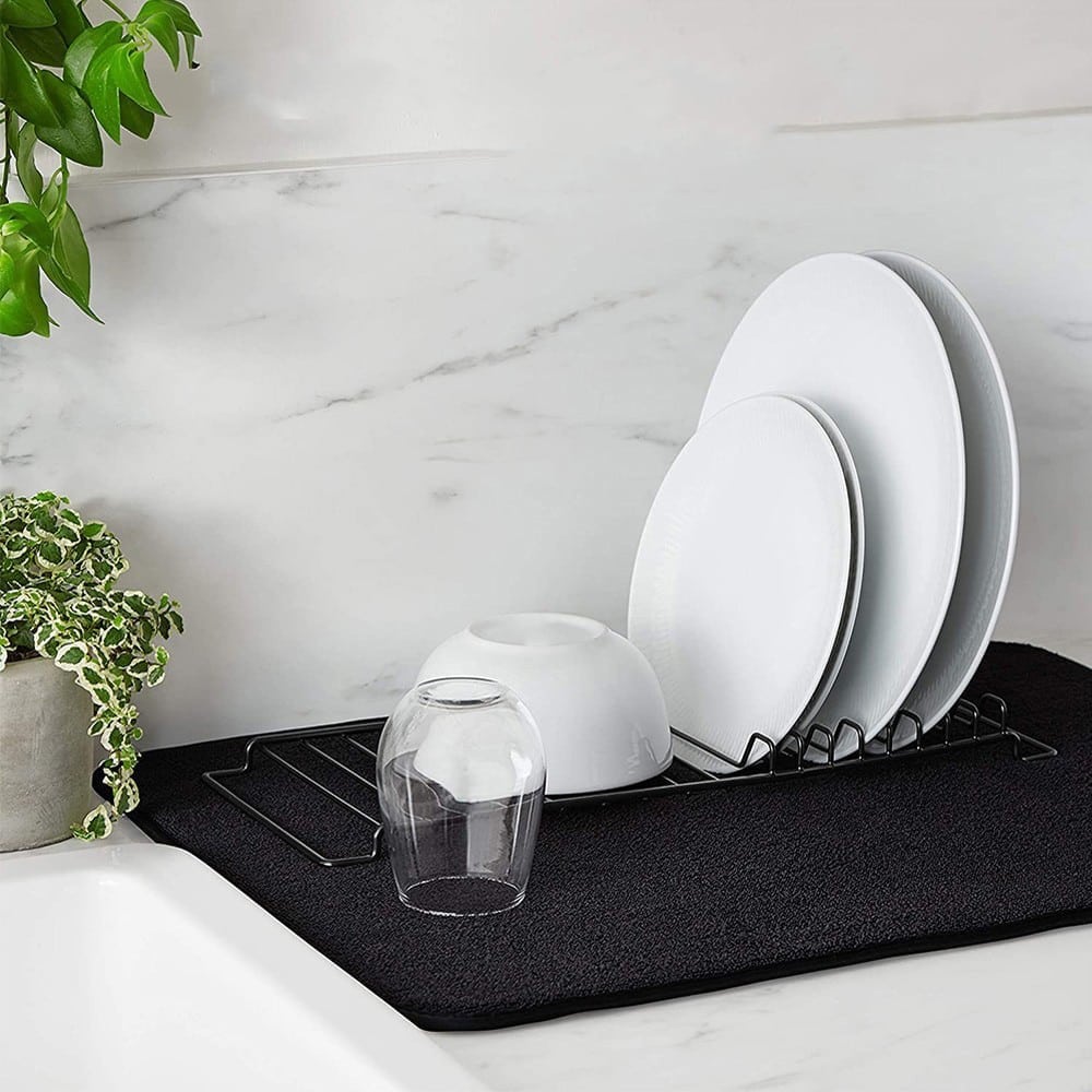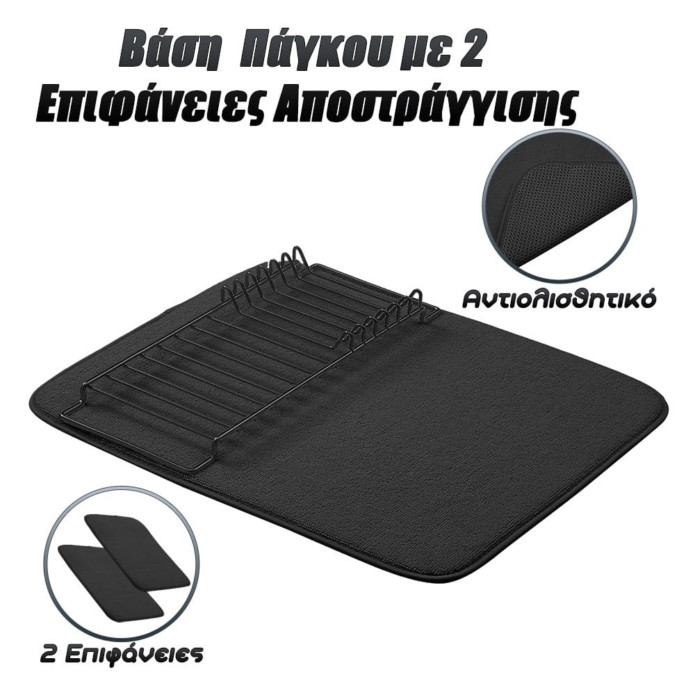 Η Βάση Αποστράγγισης Πάγκου με 2 Πανιά είναι απλή και πρακτική. Τα απορροφητικά υφασμάτινα πατάκια και τα συρμάτινα πλαίσια είναι ιδανικά για οικογενειακά και μονομελή νοικοκυριά και η απλή επιλογή για να ξεπλένετε και να στεγνώνετε γρήγορα μεγαλύτερες ποσότητες.Μπορείτε να μεταχειρίζεστε τα ποτήρια, τα κεραμικά πιάτα και τα πιάτα σερβιρίσματος με προσοχή. Το σταθερό μαξιλαράκι με επένδυση αποτρέπει το χτύπημα ή το σπάσιμο των γυαλιών και το ορθογώνιο πλαίσιο ανασηκώνει τα σκεύη και συγκρατεί περισσότερα από 7 πιάτα, καπάκια ή σανίδες κοπής.Απομακρύνουν γρήγορα την υγρασία από τα βρεγμένα πιάτα και αποτρέπουν το σχηματισμό μούχλας. Η επιφάνεια του χαλιού από πολυεστέρα που στεγνώνει γρήγορα είναι επαρκώς διαπνέουσα για να αποτρέπει την εμφάνιση μούχλας και μπορεί να πλυθεί στο πλυντήριο αν χρειαστεί. Διαθέτει ελαστική ζώνη για εύκολη αποθήκευση μεταξύ των χρήσεων.