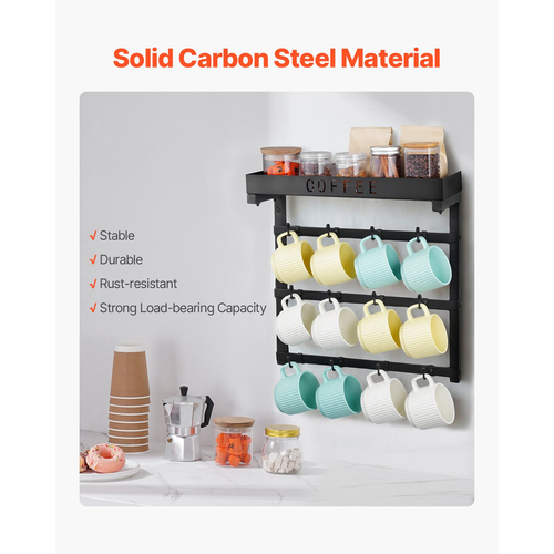 Επιτοίχια θήκη για κούπα καφέ: Αυτή η θήκη για κούπα καφέ για τοίχο διαθέτει 12 κινητούς γάντζους που μπορούν να προσαρμοστούν ανάλογα με τις ανάγκες σας. Με ένα επάνω ράφι, όχι μόνο οργανώνει τα αντικείμενά σας αλλά λειτουργεί και ως διακόσμηση, ενισχύοντας την αισθητική του χώρου σας