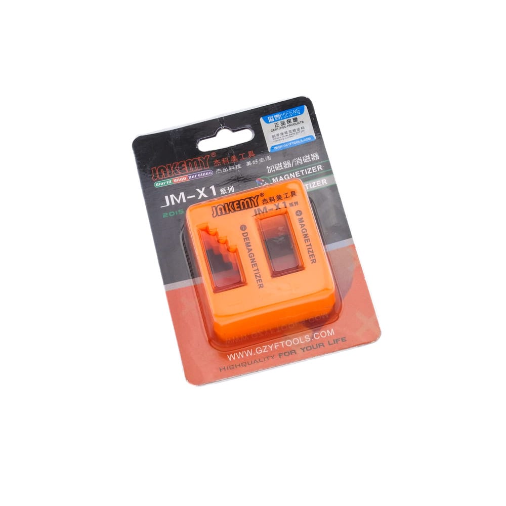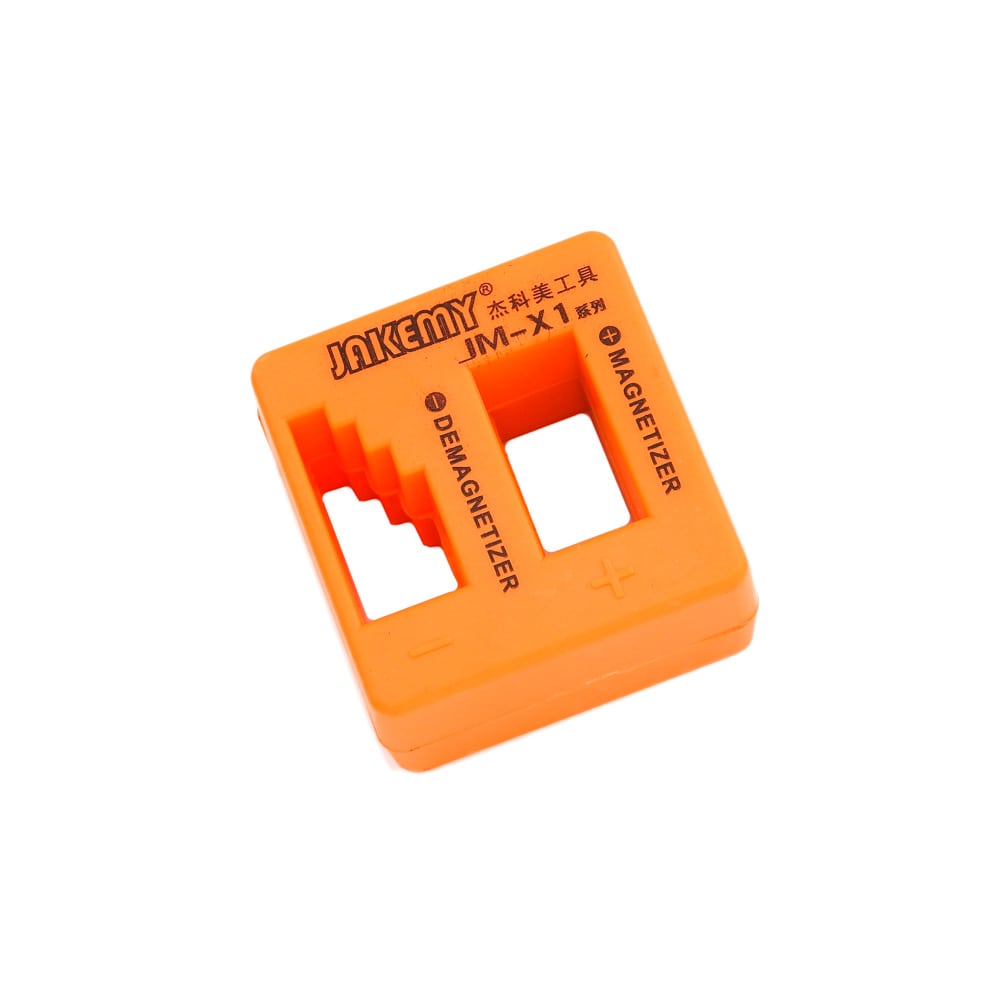 Βάση μαγνητισμού - απομαγνητισμού JM-X1 απο την JAKEMY. Πλέον μπορείτε να επαναμαγνητίσετε τα εξασθενημένα μαγνητικά κατσαβίδια σας, μόνο με μία κίνηση! Απλώς τοποθετήστε στις ανάλογες εσοχές τα εργαλεία που θέλετε να μαγνητίσετε και είστε έτοιμος! Ιδανικό για όλους τους τεχνικούς Η/Υ, τεχνικών smartphone ναι όχι μόνο. Χαρακτηριστικά: Διαστάσεις: 5cm Χ 5cm Χ 3.8cm Μαγνητίστε τα κατσαβίδια για να τους επιτρέψετε να "αρπάξουν" μικρές βίδες Απομαγνητίστε το κατσαβίδι σας για να εργαστείτε με ασφάλεια στις ευαίσθητες ηλεκτρονικές συσκευές Απεριόριστες χρήσεις εναλλαγής της μαγνήτισης Τρόπος χρήσης: Για να μαγνητίστε τα κατσαβίδια σας περάστε τη μύτη από τις ειδικές εσοχές Για να απομαγνητίσετε τα κατσαβίδια σας περάστε ολόκληρο το κατσαβίδι επανειλημμένα από τις ειδικές εσοχές DOA 14 ημερών
