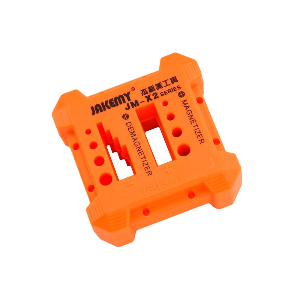 Βάση μαγνητισμού - απομαγνητισμού JM-X2 απο την JAKEMY. Πλέον μπορείτε να επαναμαγνητίσετε τα εξασθενημένα μαγνητικά κατσαβίδια σας, μόνο με μία κίνηση! Απλώς τοποθετήστε στις ανάλογες εσοχές τα εργαλεία που θέλετε να μαγνητίσετε και είστε έτοιμος! Ιδανικό για όλους τους τεχνικούς Η/Υ, τεχνικών smartphone ναι όχι μόνο. Χαρακτηριστικά: Διαστάσεις: 6,5cm Χ 6,5cm Χ 3cm Μαγνητίστε τα κατσαβίδια για να τους επιτρέψετε να "αρπάξουν" μικρές βίδες Απομαγνητίστε το κατσαβίδι σας για να εργαστείτε με ασφάλεια στις ευαίσθητες ηλεκτρονικές συσκευές 10 εσοχές διαφορετικού μεγέθους Απεριόριστες χρήσεις εναλλαγής της μαγνήτισης Τρόπος χρήσης: Για να μαγνητίστε τα κατσαβίδια σας περάστε τη μύτη από τις ειδικές εσοχές Για να απομαγνητίσετε τα κατσαβίδια σας περάστε ολόκληρο το κατσαβίδι επανειλημμένα από τις ειδικές εσοχές DOA 14 ημερών