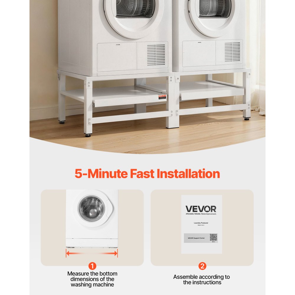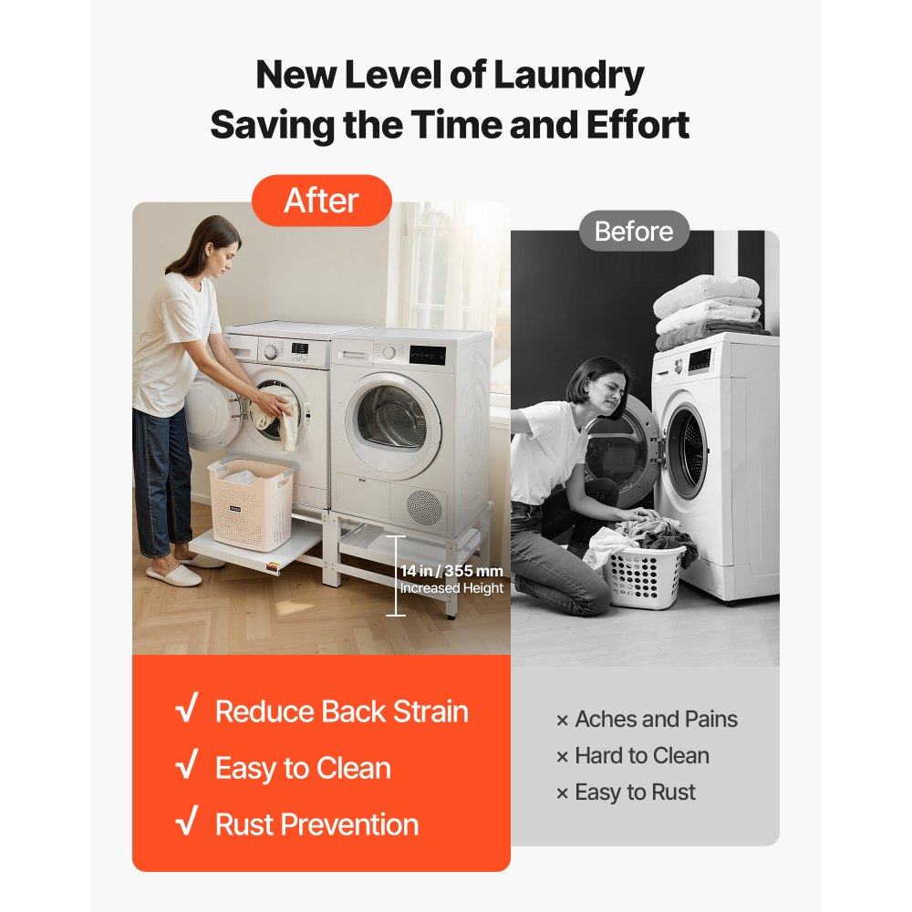 Ακριβής συμβατότητα: Μέγεθος (Μ x Π): (24,2-20,5) x (20,9-17,1) ίντσες / (615-520) x (530-435) χιλ., αυτή η ρυθμιζόμενη βάση πλυντηρίου είναι ευρέως συμβατή με Samsung, LG, Whirlpool, GE, Miele, Electrolux και Bosch, επιτρέποντάς σας να ανυψώσετε ιδανικά το πλυντήριό σας. Γρήγορη εγκατάσταση 5 λεπτών: Αυτές οι βάσεις πλυντηρίου και στεγνωτηρίου περιλαμβάνουν ένα κιτ εργαλείων και σαφείς οδηγίες για γρήγορη εγκατάσταση. Δεν απαιτούνται επαγγελματικές δεξιότητες—η εύκολη αυτοσυναρμολόγηση εξοικονομεί έως και 70% χρόνο εγκατάστασης σε σύγκριση με τις παραδοσιακές βάσεις. Εργονομικός σχεδιασμός ύψους: Με βέλτιστη ανύψωση 14 ιντσών / 355 mm, αυτό το βάθρο πλυντηρίου-στεγνωτηρίου μειώνει την καταπόνηση από την κάμψη και βοηθά στην ανακούφιση της πίεσης στην πλάτη και τα γόνατα, καθιστώντας τις εργασίες πλύσης πιο άνετες για ηλικιωμένους και χρήστες με κινητικά προβλήματα. Ισχυρή και σταθερή κατασκευή: Κατασκευασμένη από χάλυβα ψυχρής έλασης SPCC, η βάση της πλυντηρίου διαθέτει σχεδιασμό ανθεκτικό στη σκουριά και την υγρασία που βοηθά στη διατήρηση του σχήματός της με την πάροδο του χρόνου. Υποστηρίζει έως και 318 κιλά, παρέχοντας μια σταθερή βάση για καθημερινή χρήση. Επαγγελματική σταθερότητα κατά των κραδασμών: Τα μαξιλαράκια απορρόφησης κραδασμών βοηθούν τη βάση του στεγνωτηρίου να μειώσει σημαντικά τους κραδασμούς και τον θόρυβο του πλυντηρίου κατά τη λειτουργία. Λειτουργεί αξιόπιστα ακόμα και κατά τη διάρκεια κύκλων στυψίματος υψηλής ταχύτητας, υποστηρίζοντας μια πιο άνετη οικιακή κατάσταση.