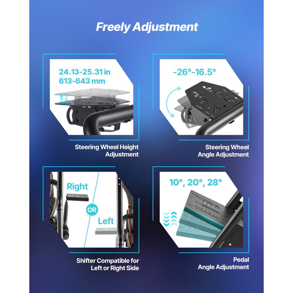 Συμβατό με τις μεγαλύτερες μάρκες: Οι προ-τρυπημένες οπές στήριξης καθιστούν αυτή τη βάση τιμονιού για αγώνες συμβατή με κορυφαία τιμόνια, πεντάλ και λεβιέ ταχυτήτων από τις Logitech, Thrustmaster, Fanatec, Hori, Mad Catz και άλλες. Αναβαθμίστε εύκολα τα αξεσουάρ σας. Σταθερό & Ασφαλές: Κατασκευασμένο από ανθρακούχο χάλυβα και ανθεκτικές συγκολλήσεις, αυτό το σταντ στήριξης τροχών υποστηρίζει έως και 137 κιλά χωρίς μετατόπιση. Οι χοντρές χαλύβδινες πλάκες και το ενισχυμένο πλαίσιο εξασφαλίζουν απόλυτη σταθερότητα, διατηρώντας τη διάταξή σας σταθερή κατά τη διάρκεια στροφών υψηλής ταχύτητας. Πλήρως ρυθμιζόμενο: Το ύψος και η γωνία του τιμονιού είναι ρυθμιζόμενα, τα πεντάλ προσφέρουν 3 ρυθμίσεις γωνίας και ο λεβιές ταχυτήτων μπορεί να αλλάξει αριστερά ή δεξιά. Αυτή η βάση προσομοίωσης αγώνων σάς επιτρέπει να απολαμβάνετε μια άνετη, ρεαλιστική εμπειρία οδήγησης σε οποιαδήποτε πίστα ή παιχνίδι αγώνων. Επαγγελματικό πιλοτήριο προσομοίωσης αγώνων: Το ύψος και η γωνία του τιμονιού είναι ρυθμιζόμενα, τα πεντάλ προσφέρουν 3 ρυθμίσεις γωνίας και η βάση του λεβιέ ταχυτήτων αλλάζει αριστερά ή δεξιά. Αυτή η βάση προσομοίωσης αγώνων σάς επιτρέπει να προσαρμόσετε τις ρυθμίσεις σας για μια πιο καθηλωτική εμπειρία οδήγησης. Βάση αγώνων συμβατή με οθόνη: Διαθέτει στιβαρή βάση οθόνης που υποστηρίζει οθόνες έως και 60 ίντσες / 77 λίβρες. Το ύψος είναι πλήρως ρυθμιζόμενο για να ταιριάζει σε οποιαδήποτε θέση καθίσματος, παρέχοντας βέλτιστη ορατότητα για σύντομα σπριντ ή μεγάλους αγώνες αντοχής στη βάση αγώνων προσομοίωσης.