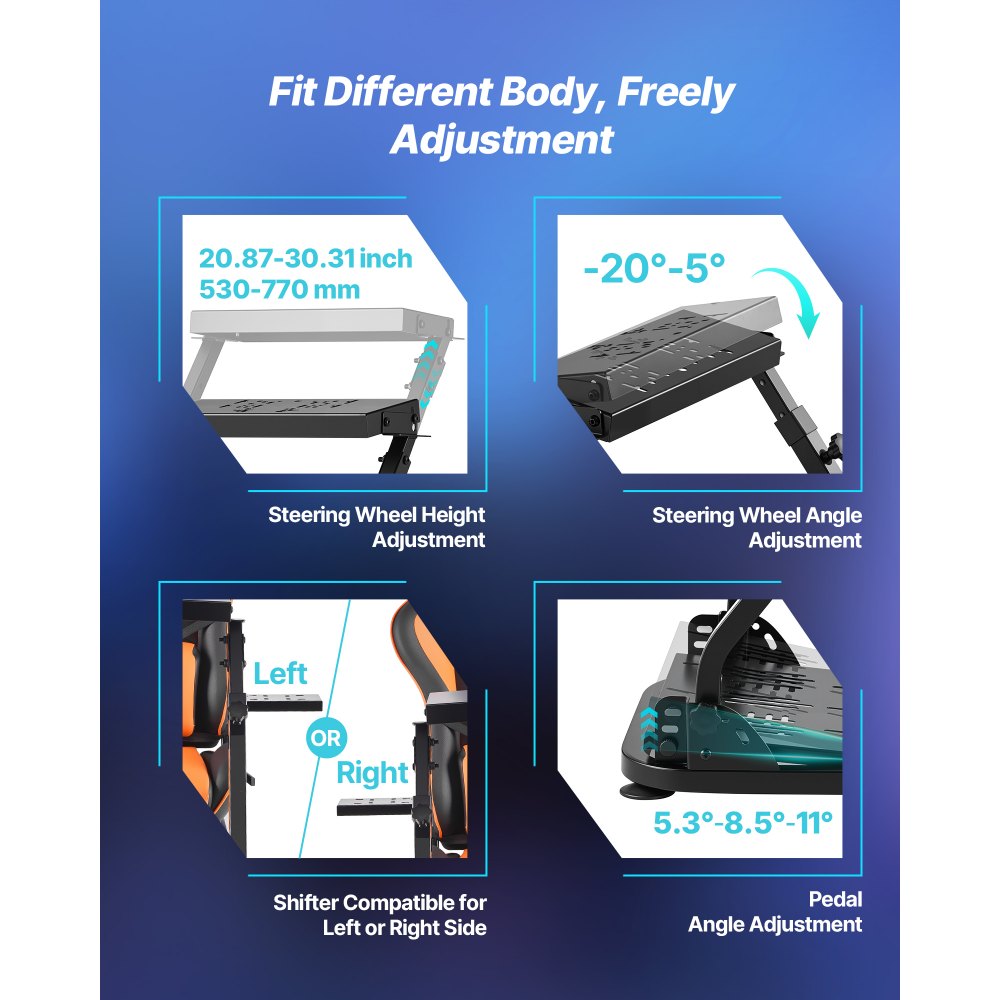 Συμβατό με τις μεγαλύτερες μάρκες: Οι προ-τρυπημένες οπές στήριξης καθιστούν αυτή τη βάση τιμονιού για αγώνες συμβατή με κορυφαία τιμόνια, πεντάλ και λεβιέδες ταχυτήτων από τις Logitech, Thrustmaster, Fanatec, Hori, Mad Catz και άλλες. Αναβαθμίστε εύκολα τα αξεσουάρ σας. Σταθερό & Ασφαλές: Κατασκευασμένο από ανθρακούχο χάλυβα και ανθεκτικές συγκολλήσεις, αυτό το σταντ στήριξης υποστηρίζει έως και 137 κιλά χωρίς μετατόπιση. Οι χοντρές χαλύβδινες πλάκες και το ενισχυμένο πλαίσιο εξασφαλίζουν απόλυτη σταθερότητα, διατηρώντας τη διάταξή σας σταθερή κατά τη διάρκεια στροφών υψηλής ταχύτητας. Πλήρως ρυθμιζόμενο: Το ύψος και η γωνία του τιμονιού είναι ρυθμιζόμενα, τα πεντάλ προσφέρουν 3 ρυθμίσεις γωνίας και ο λεβιές ταχυτήτων μπορεί να αλλάξει αριστερά ή δεξιά. Αυτή η βάση προσομοίωσης αγώνων σάς επιτρέπει να απολαμβάνετε μια άνετη, ρεαλιστική εμπειρία οδήγησης σε οποιαδήποτε πίστα ή παιχνίδι αγώνων. Επαγγελματικό πιλοτήριο προσομοίωσης αγώνων: Το κάθισμα έχει κλίση 90°–135° με ρύθμιση εμπρός/πίσω 6,3 ίντσες / 160 χιλ., προσαρμόζεται σε οδηγούς όλων των υψών και σωματότυπων. Απολαύστε μια προσαρμοσμένη, άνετη θέση για σύντομα σπριντ ή μεγάλους αγώνες αντοχής σε αυτή τη βάση προσομοίωσης αγώνων. Γρήγορη αναδίπλωση και εξοικονόμηση χώρου: Το ατσάλινο πλαίσιο υψηλής αντοχής με μαλακή ταπετσαρία προσφέρει σταθερή, υποστηρικτική θέση. Η ενσωματωμένη οσφυϊκή υποστήριξη μειώνει την καταπόνηση της σπονδυλικής στήλης κατά τη διάρκεια μεγάλων αγώνων, διατηρώντας σας συγκεντρωμένους σε κάθε σπριντ στο πιλοτήριο του προσομοιωτή αγώνων σας.