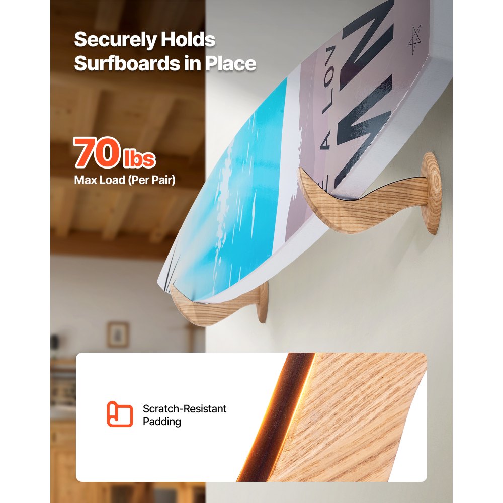 Χώρος αποθήκευσης σανίδων του σερφ: Αυτή η επιτοίχια βάση για σανίδες του σερφ σάς επιτρέπει να εκθέτετε τις σανίδες σας αντί να τις αφήνετε ακατάστατες σε ένα γκαράζ ή σοφίτα. Ιδανική για σανίδες του σερφ, σκι, skateboard και άλλα, αξιοποιεί τον χώρο στον τοίχο για να αποθηκεύει τον εξοπλισμό σας για εξοικονόμηση χώρου. Σταθερή χωρητικότητα βάρους: Κάθε βάση για σανίδες του σερφ μπορεί να αντέξει έως και 15,9 κιλά και ως ζευγάρι, υποστηρίζει έως και 31,7 κιλά, ώστε να μπορείτε να αποθηκεύετε τις σανίδες σας με σιγουριά. Τα σημεία επαφής διαθέτουν ανθεκτικά στις γρατσουνιές μαξιλαράκια για την αποφυγή ζημιών κατά τη μετακίνησή τους. Κατασκευασμένο για μακροχρόνια χρήση: Κατασκευασμένο από ξύλο φλαμουριάς υψηλής ποιότητας, αυτό το ράφι είναι ανθεκτικό στο σπάσιμο, ιδανικό για μακροχρόνια χρήση. Η επιφάνεια διαθέτει όμορφα φυσικά νερά ξύλου και είναι επεξεργασμένη με βερνίκι για ενίσχυση της αντοχής στη διάβρωση. Γρήγορη εγκατάσταση: Είτε τοποθετείτε σε γυψοσανίδα είτε σε σκυρόδεμα, η σχάρα surf συνοδεύεται από όλα τα απαραίτητα εξαρτήματα και λεπτομερείς οδηγίες, ώστε ένα άτομο να μπορεί εύκολα να ολοκληρώσει τη συναρμολόγηση. Αποθηκεύει όλες τις σανίδες σας: Ιδανική για λάτρεις των σανίδων του σερφ, σκιέρ ή skateboarders, αυτή η βάση σάς επιτρέπει να αποθηκεύετε και να προβάλλετε τις πολύτιμες σανίδες σας ως μοναδικά έργα τέχνης.