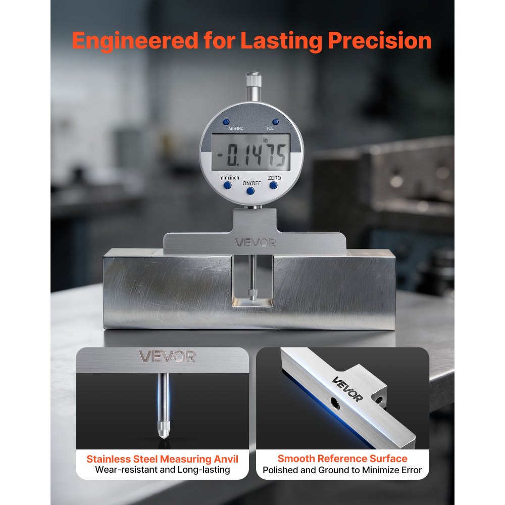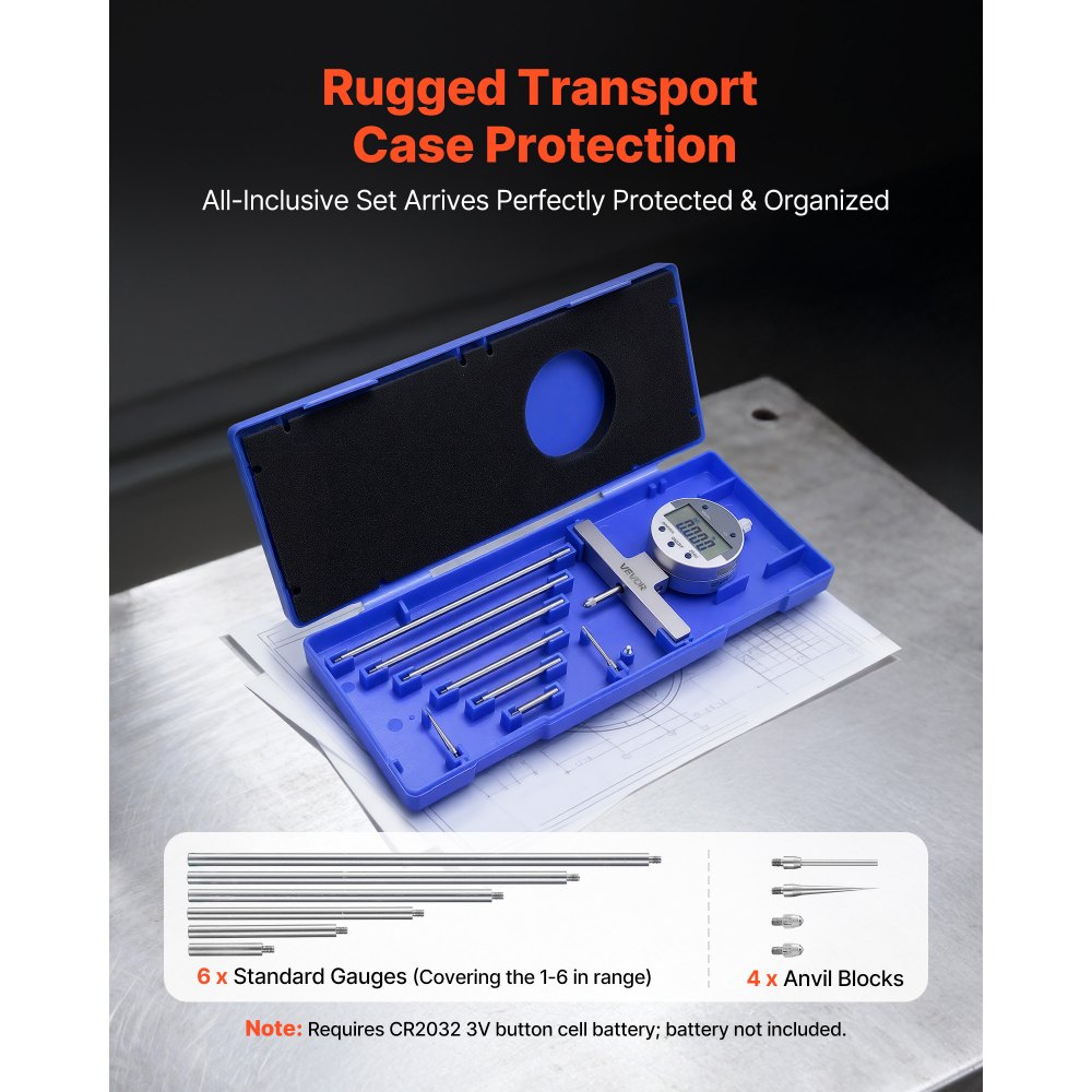 Σετ μικρομέτρων υψηλής ακρίβειας: Αυτό το μικρόμετρο βάθους παρέχει ακριβείς, αξιόπιστες γραμμικές μετρήσεις με εύρος 1–2 ίντσες/25,4–50,8 mm, ακρίβεια ±0,001 ίντσες/±0,02 mm και ανάλυση 0,0005 ίντσες/0,01 mm. Ιδανικό για τη μέτρηση εξαρτημάτων κινητήρα ή εξαρτημάτων ακριβείας. Έξυπνη και βολική λειτουργία: Αυτό το μικρόμετρο διαθέτει μεγάλη οθόνη LCD για καθαρές μετρήσεις και εναλλαγή μεταξύ βρετανικής και μετρικής μονάδας με ένα κουμπί. Η λειτουργία μηδενισμού επιτρέπει τη βαθμονόμηση σε οποιαδήποτε θέση για ταχύτερες συγκρίσεις και επαναλαμβανόμενες μετρήσεις. Ακριβής μέτρηση: Αυτός ο μετρητής βάθους διαθέτει άκμονες από ανοξείδωτο χάλυβα και λείες επιφάνειες αναφοράς για την ασφαλή συγκράτηση των τεμαχίων εργασίας και την αποφυγή σφαλμάτων μέτρησης. Το συμπαγές μεταλλικό πλαίσιο προσφέρει εξαιρετική αντοχή στη φθορά και μακροπρόθεσμη σταθερότητα για χρήση στο εργαστήριο. Ευέλικτες Εργασίες Μέτρησης: Αυτοί οι μετρητές βάθους περιλαμβάνουν τέσσερις άκμονες για να ταιριάζουν σε διαφορετικά τεμάχια εργασίας. Έξι ράβδοι βαθμονόμησης μπορούν να συνδυαστούν για εύρος 0–22 ίντσες, ιδανικό για τη μέτρηση μεταλλικών φύλλων, αυλακώσεων και άλλων βάθους, καλύπτοντας τις επαγγελματικές ανάγκες μεταλλουργίας. Πλήρες σετ: Αυτό το εργαλείο μέτρησης βάθους συνοδεύεται από μια σκληρή θήκη που περιέχει ένα μικρόμετρο βάθους, έξι ράβδους, τέσσερα αμόνια και οδηγίες. Διατηρεί τα εργαλεία οργανωμένα και φορητά, έτοιμα για άμεση χρήση στο πεδίο ή στο εργαστήριο χωρίς κίνδυνο απώλειας.