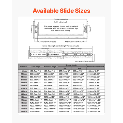 Επιλέξτε το σωστό μέγεθος: Οι διαφάνειες συρταριών πλήρους επέκτασης είναι συμβατές με τα περισσότερα μεγάλα συρτάρια και ντουλάπια. Παρακαλούμε δείτε τις εικόνες για μια λεπτομερή περιγραφή κάθε μεγέθους κατά την επιλογή. Μετρήστε το μήκος των συρταριών και των ντουλαπιών σας (εξαιρουμένων των σανίδων πλαισίου) πριν επιλέξετε τις διαφάνειες συρταριών μας. Σημείωση: Το μήκος της διαφάνειας δεν πρέπει να είναι μικρότερο ή ίσο με το βάθος του συρταριού.