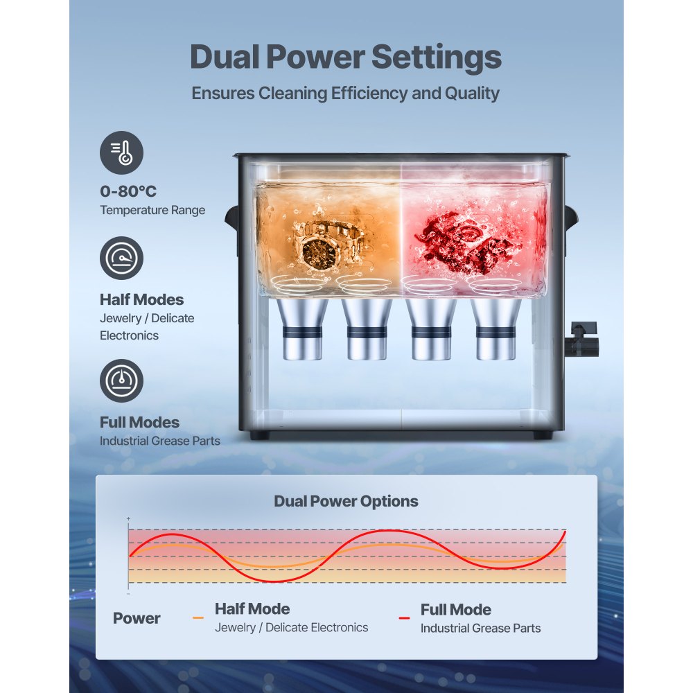 Ισχυρός καθαρισμός: Τα υπερηχητικά κύματα 40kHz δημιουργούν μικροφυσαλίδες που απομακρύνουν γρήγορα λάδια και σωματίδια από δυσπρόσιτα σημεία, όπως καρμπυρατέρ, ακροφύσια ψεκασμού και μικρά εξαρτήματα. Χρησιμοποιήστε το με ουδέτερο απορρυπαντικό και ζεστό νερό για βέλτιστα αποτελέσματα. Διπλές λειτουργίες ισχύος: Η λειτουργία απαερίωσης αυτού του υπερηχητικού καθαριστικού αφαιρεί τον αέρα από τα υγρά, ενισχύοντας την απόδοση κατά 30%. Οι διπλές ρυθμίσεις ισχύος παρέχουν ακριβή καθαρισμό για ευαίσθητα αντικείμενα ή βαριά εξαρτήματα χωρίς ζημιές. Εύκολη λειτουργία: Μπορείτε να ρυθμίσετε τη συχνότητα, την ώρα και τη θερμοκρασία με ένα απλό κουμπί. Ρυθμίστε γρήγορα τις ιδανικές παραμέτρους για κοσμήματα, ρολόγια και βιομηχανικά εξαρτήματα με το υπερηχητικό καθαριστικό εξαρτημάτων μας. Ανώτερη Ποιότητα: Κατασκευασμένο από ανοξείδωτο ατσάλι 304 ανθεκτικό στη διάβρωση, το μηχάνημα καθαρισμού με υπερήχους διαθέτει καλάθι ανθεκτικό στις γρατσουνιές και αναβαθμισμένη λαβή για εύκολο χειρισμό. Η ψηφιακή οθόνη κάνει τη λειτουργία απλή. Ευέλικτη χρήση: Το sonic cleaner μας με κουμπί καθαρίζει ένα ευρύ φάσμα υλικών, από μέταλλα έως όργανα ακριβείας. Οι ρυθμιζόμενες ρυθμίσεις εξασφαλίζουν βέλτιστα αποτελέσματα για διάφορα αντικείμενα. Χρησιμοποιήστε την ανάρτηση του καλαθιού για ομοιόμορφο καθαρισμό και για την προστασία της δεξαμενής.