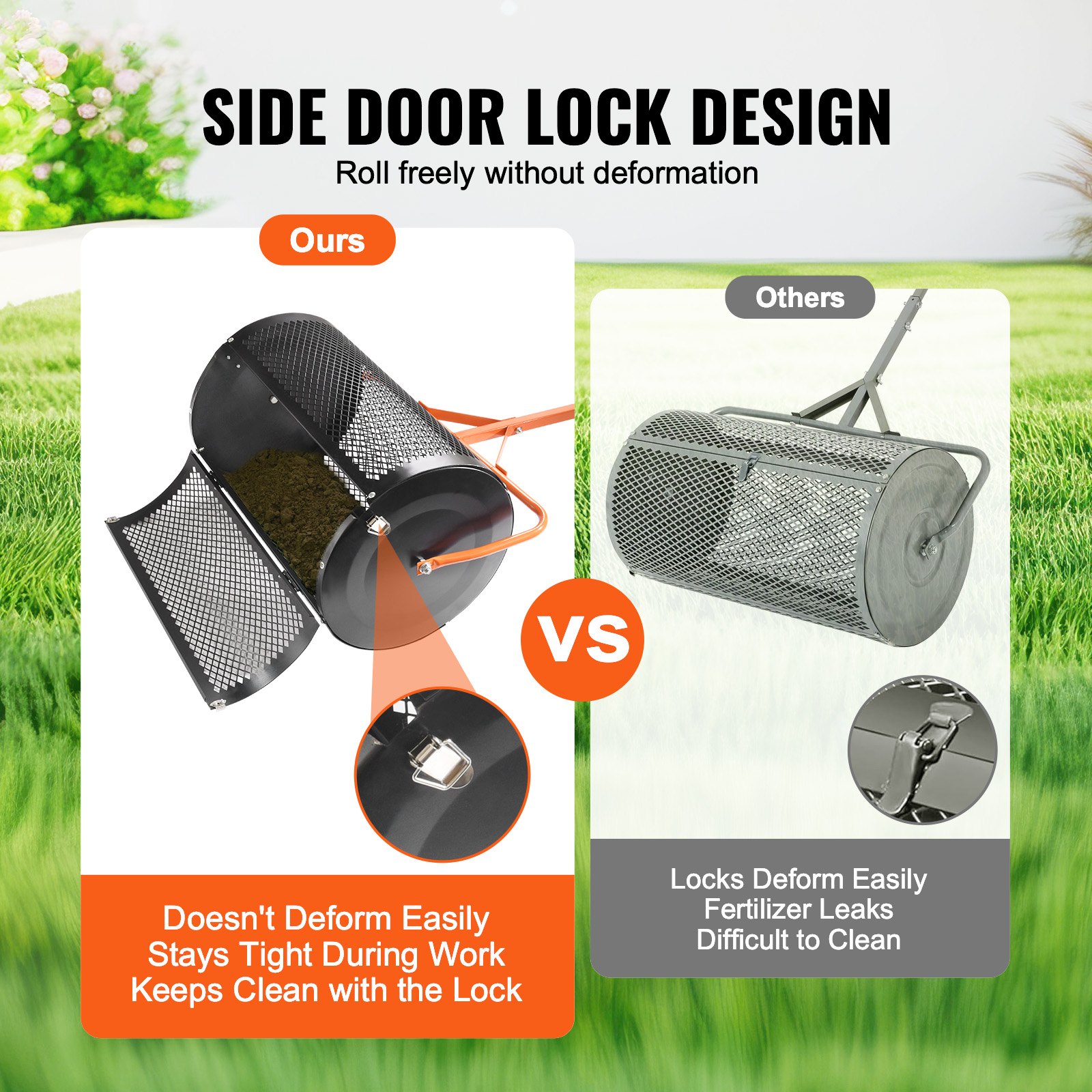 Εύκολος χειρισμός και εγκατάσταση: Ο διασκορπιστής τύρφης είναι εξοπλισμένος με αναβαθμισμένο σχεδιασμό μεντεσέδων που επιτρέπει μεγαλύτερη γωνία ανοίγματος, διευκολύνοντας το γέμισμα και τον καθαρισμό των υλικών διασποράς. Η κλειδαριά της πλευρικής πόρτας είναι τοποθετημένη για ασφάλεια και σταθερότητα κατά τη χρήση. Η εγκατάσταση είναι απλή και διαρκεί μόνο 10 λεπτά. απλώς συναρμολογήστε το δίσκο, τις πλάκες του καλαθιού και τη ράβδο λαβής με τη σειρά και είστε έτοιμοι. Αυτό κάνει τις εργασίες κηπουρικής σας ευκολότερες και πιο ευχάριστες.