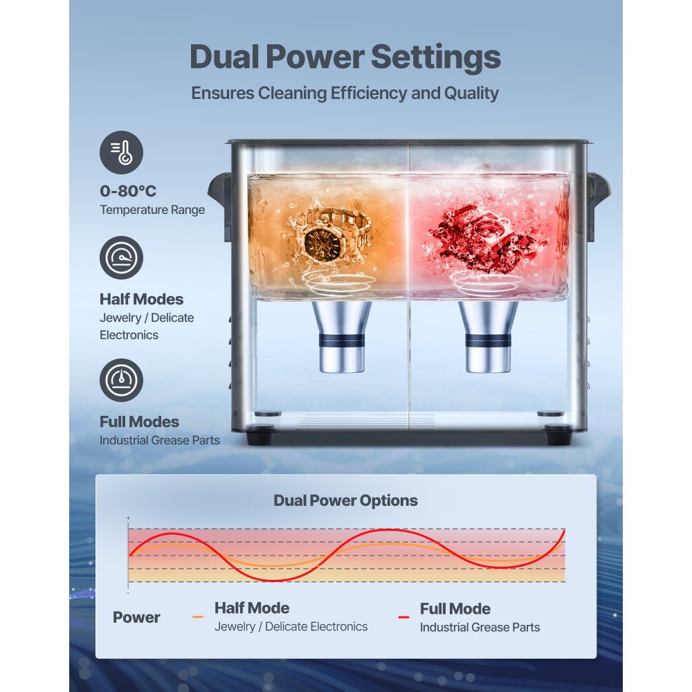 Ισχυρός καθαρισμός: Τα υπερηχητικά κύματα 40kHz δημιουργούν μικροφυσαλίδες που απομακρύνουν γρήγορα λάδια και σωματίδια από δυσπρόσιτα σημεία, όπως καρμπυρατέρ, ακροφύσια ψεκασμού και μικρά εξαρτήματα. Χρησιμοποιήστε το με ουδέτερο απορρυπαντικό και ζεστό νερό για βέλτιστα αποτελέσματα. Διπλές λειτουργίες ισχύος: Η λειτουργία απαερίωσης αυτού του υπερηχητικού καθαριστικού αφαιρεί τον αέρα από τα υγρά, ενισχύοντας την απόδοση κατά 30%. Οι διπλές ρυθμίσεις ισχύος παρέχουν ακριβή καθαρισμό για ευαίσθητα αντικείμενα ή βαριά εξαρτήματα χωρίς ζημιές. Εύκολη λειτουργία: Μπορείτε να ρυθμίσετε τη συχνότητα, την ώρα και τη θερμοκρασία με ένα απλό κουμπί. Ρυθμίστε γρήγορα τις ιδανικές παραμέτρους για κοσμήματα, ρολόγια και βιομηχανικά εξαρτήματα με το υπερηχητικό καθαριστικό εξαρτημάτων μας. Ανώτερη Ποιότητα: Κατασκευασμένο από ανοξείδωτο ατσάλι 304 ανθεκτικό στη διάβρωση, το μηχάνημα καθαρισμού με υπερήχους διαθέτει καλάθι ανθεκτικό στις γρατσουνιές και αναβαθμισμένη λαβή για εύκολο χειρισμό. Η ψηφιακή οθόνη κάνει τη λειτουργία απλή. Ευέλικτη χρήση: Το sonic cleaner μας με κουμπί καθαρίζει ένα ευρύ φάσμα υλικών, από μέταλλα έως όργανα ακριβείας. Οι ρυθμιζόμενες ρυθμίσεις εξασφαλίζουν βέλτιστα αποτελέσματα για διάφορα αντικείμενα. Χρησιμοποιήστε την ανάρτηση του καλαθιού για ομοιόμορφο καθαρισμό και για την προστασία της δεξαμενής.