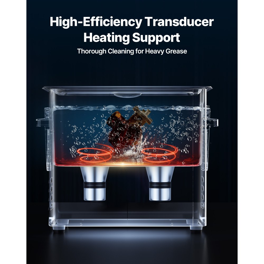 Ισχυρή απόδοση καθαρισμού: Τα υπερηχητικά κύματα 40kHz παράγουν 40.000 μικροφυσαλίδες ανά δευτερόλεπτο, «εκρήγνυνται» σαν χιλιάδες μικροσκοπικές βούρτσες. Αφαιρούν λίπος, βρωμιά και υπολείμματα από τα κανάλια του καρμπυρατέρ, τις άκρες των αερογράφου, το λουράκι του ρολογιού, μικρά εξαρτήματα και άλλα. Προηγμένη Τεχνολογία Αισθητήρων: Εξοπλισμένο με αισθητήρες υψηλής απόδοσης, το υπερηχητικό καθαριστικό μας προσφέρει εκρηκτική καθαριστική ισχύ που διασπά τα επίμονα λίπη και τη βρωμιά. Παρέχει βαθύ καθαρισμό 360° για όργανα ακριβείας, αφαιρώντας βρωμιά και λάδια. Κατάλληλο για πολλαπλά υλικά: Ιδανικό για κοσμήματα, ρολόγια/ηλεκτρονικά εξαρτήματα ή βιομηχανικά εξαρτήματα με έντονους λεκέδες λαδιού. Οι ρυθμιζόμενες θερμοκρασίες καθαρισμού από 0–80°C επιταχύνουν τη διάλυση της βρωμιάς, παρέχοντας πιο αποτελεσματικό και στοχευμένο καθαρισμό. Σχεδιασμός υψηλής ποιότητας: Το sonic cleaner διαθέτει καλάθι και εσωτερική δεξαμενή από ανοξείδωτο ατσάλι ανθεκτικό στη διάβρωση, ενώ το καλάθι αποτρέπει τις γρατσουνιές. Η αναβαθμισμένη λαβή διευκολύνει τη μεταφορά της γεμάτης δεξαμενής και η ψηφιακή οθόνη εξασφαλίζει απλή και ακριβή λειτουργία. Ευρύ φάσμα εφαρμογών: Ιδανικό για μέταλλα και όργανα ακριβείας: καρμπυρατέρ, μηχανικά μέρη, αερογράφοι, λουράκια ρολογιών, εξαρτήματα, εξαρτήματα εργαστηρίου και άλλα. Οι προσαρμόσιμες ρυθμίσεις θερμοκρασίας και χρονοδιακόπτη καλύπτουν περισσότερα υλικά και σενάρια.