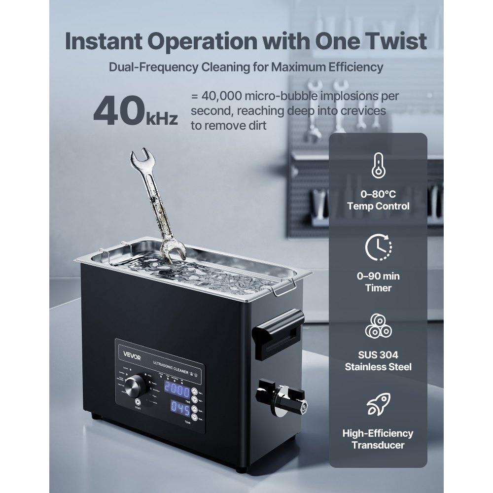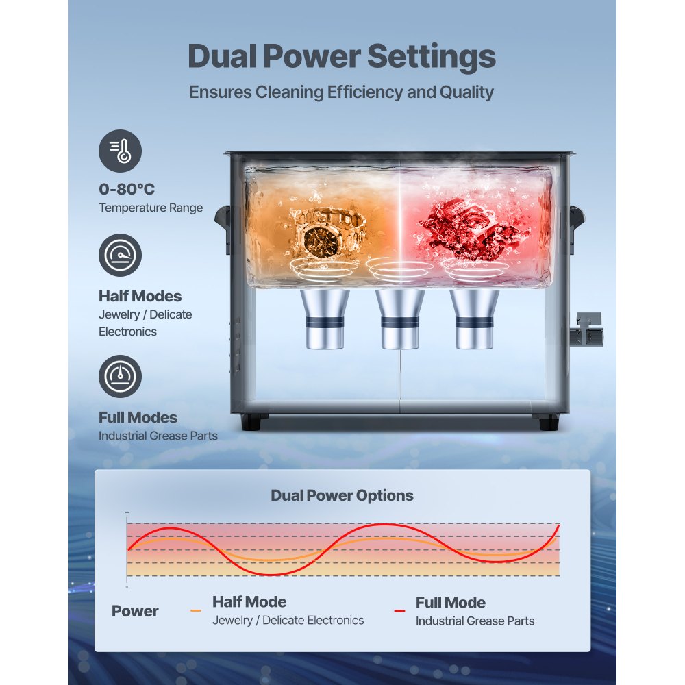 Ισχυρός καθαρισμός: Τα υπερηχητικά κύματα 40kHz δημιουργούν μικροφυσαλίδες που απομακρύνουν γρήγορα λάδια και σωματίδια από δυσπρόσιτα σημεία, όπως καρμπυρατέρ, ακροφύσια ψεκασμού και μικρά εξαρτήματα. Χρησιμοποιήστε το με ουδέτερο απορρυπαντικό και ζεστό νερό για βέλτιστα αποτελέσματα. Διπλές λειτουργίες ισχύος: Η λειτουργία απαερίωσης αυτού του υπερηχητικού καθαριστικού αφαιρεί τον αέρα από τα υγρά, ενισχύοντας την απόδοση κατά 30%. Οι διπλές ρυθμίσεις ισχύος παρέχουν ακριβή καθαρισμό για ευαίσθητα αντικείμενα ή βαριά εξαρτήματα χωρίς ζημιές. Εύκολη λειτουργία: Μπορείτε να ρυθμίσετε τη συχνότητα, την ώρα και τη θερμοκρασία με ένα απλό κουμπί. Ρυθμίστε γρήγορα τις ιδανικές παραμέτρους για κοσμήματα, ρολόγια και βιομηχανικά εξαρτήματα με το υπερηχητικό καθαριστικό εξαρτημάτων μας. Ανώτερη Ποιότητα: Κατασκευασμένο από ανοξείδωτο ατσάλι 304 ανθεκτικό στη διάβρωση, το μηχάνημα καθαρισμού με υπερήχους διαθέτει καλάθι ανθεκτικό στις γρατσουνιές και αναβαθμισμένη λαβή για εύκολο χειρισμό. Η ψηφιακή οθόνη κάνει τη λειτουργία απλή. Ευέλικτη χρήση: Το sonic cleaner μας με κουμπί καθαρίζει ένα ευρύ φάσμα υλικών, από μέταλλα έως όργανα ακριβείας. Οι ρυθμιζόμενες ρυθμίσεις εξασφαλίζουν βέλτιστα αποτελέσματα για διάφορα αντικείμενα. Χρησιμοποιήστε την ανάρτηση του καλαθιού για ομοιόμορφο καθαρισμό και για την προστασία της δεξαμενής.