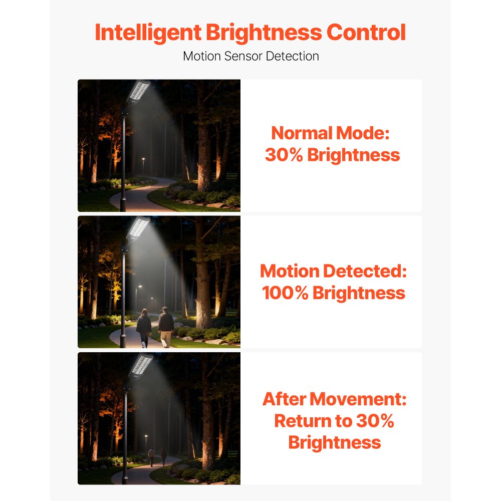 Φωτεινό Ηλιακό Φωτιστικό Δρόμου: Εξοπλισμένο με 5730 χάντρες LED υψηλής φωτεινότητας και εξοικονόμησης ενέργειας, αυτό το ηλιακό φωτιστικό δρόμου εξωτερικού χώρου 8.000W προσφέρει ισχυρή δέσμη ευρείας γωνίας 240° με εντυπωσιακή ένταση 450.000 lumen. Φωτίστε κάθε γωνιά της αυλής σας. Ηλιακή ενέργεια εξοικονόμησης ενέργειας: Πλήρως τροφοδοτούμενο από ηλιακή ενέργεια, το φως στάθμευσης μας συλλέγει ηλιακή ενέργεια και την αποθηκεύει σε μια μπαταρία λιθίου 20.000 mAh κατά τη διάρκεια της ημέρας. Μόλις φορτιστεί πλήρως, παρέχει έως και 20 ώρες συνεχούς φωτισμού τη νύχτα. Έξυπνος έλεγχος, ρυθμιζόμενος φωτισμός: Ελεγχόμενο μέσω τηλεχειριστηρίου RF, το ηλιακό φως δρόμου LED μας παρέχει 4 λειτουργίες. Ο αισθητήρας κίνησης ρυθμίζει αυτόματα τη φωτεινότητα, η ανίχνευση φωτός από το σούρουπο έως την αυγή ενεργοποιείται/απενεργοποιείται, η ρύθμιση χρονοδιακόπτη και η ρυθμιζόμενη φωτεινότητα. Ισχυρή αντοχή στις καιρικές συνθήκες: Κατασκευασμένο με υλικό υψηλής ποιότητας, αυτό το ηλιακό φωτιστικό δρόμου εξασφαλίζει μια στιβαρή, ανθεκτική στα θραύσματα κατασκευή. Με βαθμολογία στεγανότητας IP67, λειτουργεί αξιόπιστα σε βροχή, χιόνι και συνθήκες υψηλής θερμοκρασίας. Εύκολη εγκατάσταση και χρήση: Συνοδεύεται από όλα τα αξεσουάρ τοποθέτησης, το εμπορικό ηλιακό φωτιστικό εξωτερικού χώρου μας είναι εύκολο στην εγκατάσταση χωρίς καλωδίωση—απλώς στερεώστε το με βίδες. Ιδανικό για αυλές, δρόμους, αυλές, γκαράζ, μπαλκόνια, γήπεδα μπάσκετ και πλατείες.