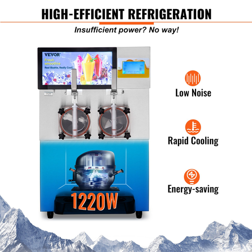 2 x 8L Slushie Machine: Διπλό μπολ λάσπης μηχανής, χωρητικότητας 8L (2,1 US gal). Η εμπορική μας λασπώδης μηχανή μπορεί να παράγει 26-32 λίτρα λασπωμένων και 15-21 λίτρα αλκοολούχων ποτών ανά ώρα, τροφοδοτώντας ταυτόχρονα πολλούς ανθρώπους. Επιπλέον, η λειτουργία προψύξης και συντήρησης σας επιτρέπει να προψύξετε κατά τη διάρκεια της ημέρας και να διατηρήσετε τη φρεσκάδα τη νύχτα για να διατηρήσετε καλύτερα τη γεύση σας. Απολαύστε ένα δροσιστικό ποτό οποιαδήποτε στιγμή.