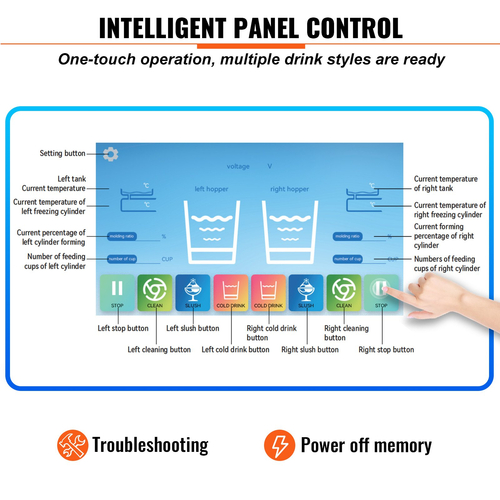 Πίνακας ελέγχου ακριβείας: Αυτό το μηχάνημα λάσπης είναι εξοπλισμένο με ένα εύχρηστο πάνελ. Κάθε μπολ μπορεί να λειτουργήσει ανεξάρτητα, με μια καθαρή ψηφιακή οθόνη με μια ματιά. Η προσαρμογή του πάχους σύμφωνα με τις ανάγκες σας δεν ήταν ποτέ ευκολότερη. Η απλή λειτουργία με ένα πάτημα επιτρέπει να σερβίρετε τα αγαπημένα σας παγωμένα ποτά. Υπάρχουν επίσης προσεκτικές ρυθμίσεις για τη διάγνωση βλαβών και τη μνήμη διακοπής ρεύματος.