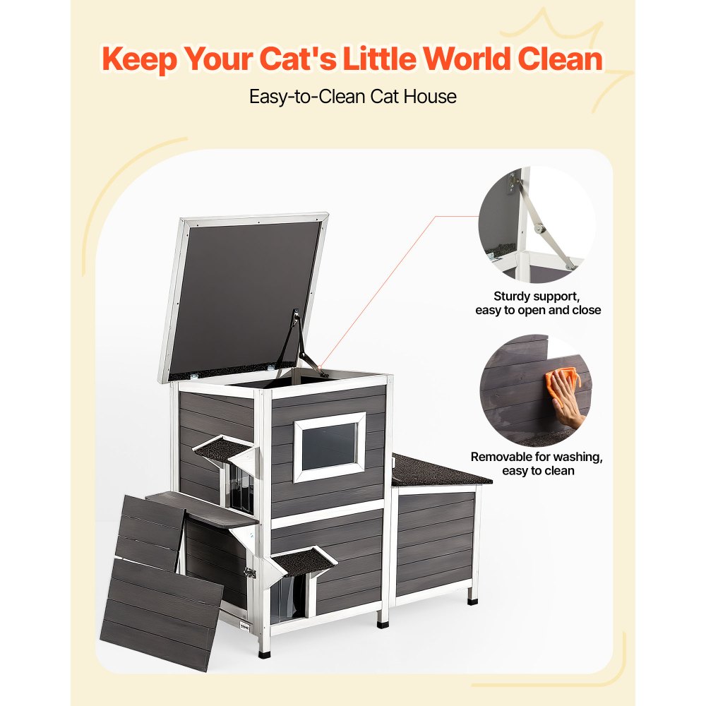 Ανθεκτικό στις καιρικές συνθήκες και στις καιρικές συνθήκες: Κατασκευασμένο με συμπαγή πάνελ από ξύλο ελάτης και ασφαλτική στέγη, αυτό το εξωτερικό καταφύγιο για γάτες είναι αδιάβροχο, ανθεκτικό στην υγρασία και κατασκευασμένο για να αντέχει στη βροχή, το χιόνι και τον ήλιο. Η κεκλιμένη στέγη και τα υπερυψωμένα πόδια 2,64" αποτρέπουν τη συσσώρευση νερού, διατηρώντας το εσωτερικό στεγνό. Ιδιωτικός Χώρος για Γάτες: Με πλάτος 42", το καταφύγιο για άγριες γάτες παρέχει άφθονο χώρο για έως και 3 γάτες. Με 3 ξεχωριστά δωμάτια, κάθε γάτα έχει τον δικό της ιδιωτικό χώρο για να ξεκουράζεται, να παίζει ή να τρώει χωρίς ενόχληση. Άνεση για όλες τις εποχές: Το υπερυψωμένο σπιτάκι για γάτες διαθέτει πολλαπλά διαφανή παράθυρα και πτερύγια PVC που επιτρέπουν τη ροή του ηλιακού φωτός και του αέρα, ενώ παράλληλα επιτρέπουν στις γάτες να παρατηρούν το περιβάλλον τους, μειώνοντας το άγχος και τη μοναξιά. Εύκολος καθαρισμός: Το εξωτερικό καταφύγιο για γάτες με αρθρωτή οροφή ανοίγει για γρήγορη πρόσβαση, ενώ τα αφαιρούμενα πάνελ δαπέδου κάνουν τον βαθύ καθαρισμό πανεύκολο. Διατηρεί το καταφύγιο υγιεινό και άοσμο. Κομψό & Ευέλικτο: Το ξύλινο σπιτάκι μας για γάτες με μοντέρνο μινιμαλιστικό σχεδιασμό εντάσσεται εύκολα σε κήπους, βεράντες, μπαλκόνια ή εσωτερικούς χώρους. Λειτουργεί τόσο ως λειτουργικό σπιτάκι κατοικίδιων όσο και ως κομψή πινελιά στο σπίτι.