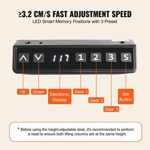 Γρήγορη ρύθμιση ύψους: Απολαύστε γρήγορες μεταβάσεις με ταχύτητα ανύψωσης ≥3,2 cm/s, που συμπληρώνεται από έναν ελεγκτή LED ικανό να απομνημονεύει τρία προκαθορισμένα ύψη για εύκολη εναλλαγή μεταξύ των τρόπων εργασίας. Η διαισθητική διεπαφή κουμπιών και η θύρα USB για φόρτιση κάνουν τη λειτουργία παιχνιδάκι.