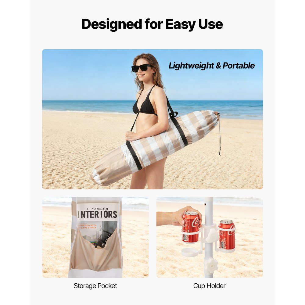 Καμπάνα παραλίας 8 x 8 ποδιών: Αυτή η ευρύχωρη καμπάνα παραλίας με πλαϊνή κουρτίνα φιλοξενεί άνετα τέσσερα έως πέντε άτομα, καρέκλες και εξοπλισμό. Σχεδιασμένη με ποτηροθήκες και τσέπες αποθήκευσης, διατηρεί τα ποτά, τα τηλέφωνα, τα γυαλιά ηλίου και το αντηλιακό σε κοντινή απόσταση. Αντηλιακή προστασία UPF 50+: Κατασκευασμένη από ύφασμα ανθεκτικό στον ήλιο 210D, η σκηνή παραλίας Cabana προσφέρει σκιά και μειώνει τον κίνδυνο ηλιακού εγκαύματος. Η πλευρική κουρτίνα διαθέτει αναπνεύσιμο πλέγμα, που προάγει τη ροή του αέρα και απωθεί τη θερμότητα, δημιουργώντας ένα πιο δροσερό περιβάλλον από κάτω. Ρυθμιζόμενο ύψος: Η μεγάλη καμπάνα στην παραλία διαθέτει αναβαθμισμένο ρυθμιζόμενο στύλο σύνδεσης, που επιτρέπει εύρος ύψους 6,9-7,9 πόδια (2,1-2,4 μ.). Αυτό παρέχει περισσότερο χώρο για το κεφάλι, ώστε να μπορείτε να στέκεστε άνετα χωρίς να σκύβετε και να απολαμβάνετε ένα ευρύτερο οπτικό πεδίο. Επίπεδο αντοχής στον άνεμο 4-5: Εξοπλισμένη με ένα στιβαρό ατσάλινο σκελετό, έναν βιδωτό κύριο στύλο, σακιά με άμμο και πασσάλους εδάφους, αυτή η σκηνή καμπάνα εύκολης εγκατάστασης παραμένει σταθερά αγκυρωμένη στην άμμο. Αντέχει στην κατάρρευση ή την απομάκρυνση από τον άνεμο, ακόμη και κάτω από ελαφριά θαλασσινή αύρα. Γρήγορη και εύκολη εγκατάσταση: Ένα άτομο μπορεί να στήσει αυτή τη σκηνή καμπάνα σε τρία έως τέσσερα λεπτά χωρίς ειδικά εργαλεία. Διαθέτει μια συμπαγή τσάντα μεταφοράς με ιμάντα ώμου, γεγονός που την καθιστά ελαφριά και εύκολη στη μεταφορά στην παραλία.