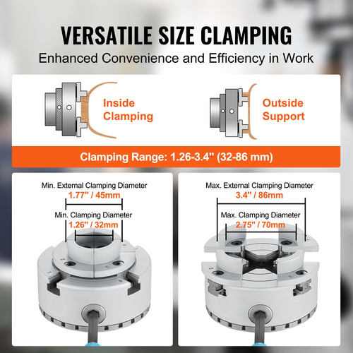 Αριθμός μοντέλου προϊόντος: KP96Εξωτερική διάμετρος τσοκ: 3,75" / φ96 mmΕύρος σύσφιξης (εσωτερικό): 1,26-2,75"" (32-70 mm)Εσωτερικό νήμα τσοκ: M33*3.5TPIΕύρος υποστήριξης (εξωτερικό): 1,77-3,4"" (45-86 mm)Εξωτερική Διάμετρος Διαρροή: ≤0,15 mmΡάβδος δοκιμής Radial Runout: ≤0,40 mm σε απόσταση 50 mmΔοκιμαστικός Δακτύλιος Τελικής Πρόσοψης: ≤0,15 mmΕπεξεργασία επιφάνειας και χρώμα: ≤Ra1.6, επιχρωμιωμένο φυσικό χρώμαΚύριο υλικό: 45#Διαστάσεις προϊόντος: φ96 x 80 mmεγχειρίδιο: https://d2v0huudrf11kh.cloudfront.net/vevor-center-goods/%E6%9C%A8%E5%B7%A5%E5%8D%A1%E7%9B%98%E8%AF%B4%E6%98%8E%E4%B9%A6%E7%BB%88%E7%89%88_1687849033213.pdf
