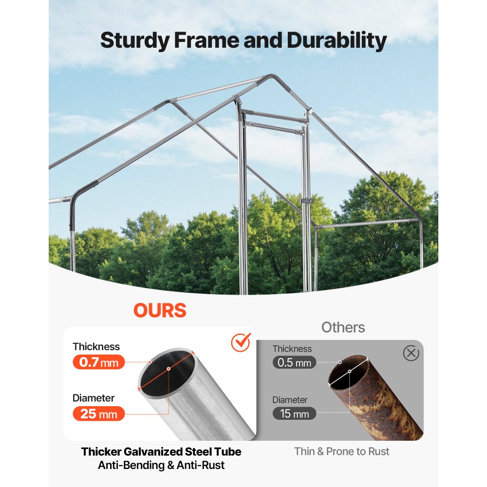 Ευρύχωρος σχεδιασμός με δυνατότητα εντοιχισμού: Το μεγάλο κοτέτσι διαθέτει ευρύχωρο εσωτερικό που επιτρέπει στις κότες να κινούνται ελεύθερα. Ο ψηλός σχεδιασμός παρέχει εύκολη πρόσβαση για τάισμα και καθάρισμα. Τα ανοιχτά τοιχώματα από πλέγμα εξασφαλίζουν εξαιρετικό αερισμό. Κατάλληλο για πάπιες και κουνέλια. Ενισχυμένο γαλβανισμένο ατσάλινο πλαίσιο: Κατασκευασμένο από γαλβανισμένο ατσάλι ανθεκτικό στη διάβρωση και αγκυρωμένο με πασσάλους εδάφους για σταθερότητα. Αυτό το κοτέτσι είναι κατασκευασμένο για να αντέχει σε ισχυρούς ανέμους, έντονο χιόνι και σκληρές καιρικές συνθήκες για μακροχρόνια ανθεκτικότητα. Βελτιωμένο καταφύγιο: Το κοτέτσι μας με χοντρό εξαγωνικό συρμάτινο πλέγμα που ασφαλίζεται με φερμουάρ εμποδίζει τη διαφυγή των πουλερικών. Ο πάτος διαθέτει σπειροειδές σύρμα και εκτεταμένα μάνδαλα πόρτας για να αποτρέπουν τα αρπακτικά ζώα όπως τα ρακούν και οι αλεπούδες από το να εισβάλουν. Στέγη παντός καιρού: Η στέγη PE μπορεί να εγκατασταθεί γρήγορα, παρέχοντας σκιά τις ηλιόλουστες ημέρες και ένα στεγνό καταφύγιο κατά τη διάρκεια της βροχής. Η στέγη με σπείρωμα επιτρέπει στη βροχή και το χιόνι να γλιστρούν φυσικά, αποτρέποντας τη συσσώρευση. Η κορυφή δημιουργεί χώρο για κρεμαστά φωτιστικά. Εύκολη συναρμολόγηση: Ο διάδρομος για κοτέτσια με στέγη περιλαμβάνει όλα τα απαραίτητα αξεσουάρ - γάντια, πασσάλους εδάφους και φερμουάρ. Σχεδιασμένο για δύο άτομα και μπορεί να συναρμολογηθεί σε περίπου 1-2 ώρες.