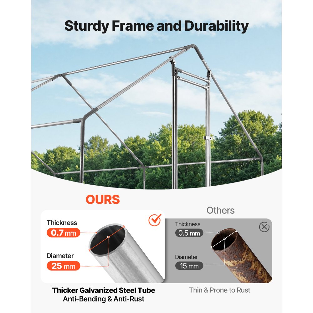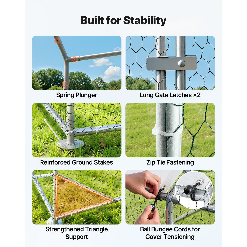 Ευρύχωρος σχεδιασμός με δυνατότητα εντοιχισμού: Το μεγάλο κοτέτσι διαθέτει ευρύχωρο εσωτερικό που επιτρέπει στις κότες να κινούνται ελεύθερα. Ο ψηλός σχεδιασμός παρέχει εύκολη πρόσβαση για τάισμα και καθάρισμα. Τα ανοιχτά τοιχώματα από πλέγμα εξασφαλίζουν εξαιρετικό αερισμό. Κατάλληλο για πάπιες και κουνέλια. Ενισχυμένο γαλβανισμένο ατσάλινο πλαίσιο: Κατασκευασμένο από γαλβανισμένο ατσάλι ανθεκτικό στη διάβρωση και αγκυρωμένο με πασσάλους εδάφους για σταθερότητα. Αυτό το κοτέτσι είναι κατασκευασμένο για να αντέχει σε ισχυρούς ανέμους, έντονο χιόνι και σκληρές καιρικές συνθήκες για μακροχρόνια ανθεκτικότητα. Βελτιωμένο καταφύγιο: Το κοτέτσι μας με χοντρό εξαγωνικό συρμάτινο πλέγμα που ασφαλίζεται με φερμουάρ εμποδίζει τη διαφυγή των πουλερικών. Ο πάτος διαθέτει σπειροειδές σύρμα και εκτεταμένα μάνδαλα πόρτας για να αποτρέπουν τα αρπακτικά ζώα όπως τα ρακούν και οι αλεπούδες από το να εισβάλουν. Στέγη παντός καιρού: Η στέγη PE μπορεί να εγκατασταθεί γρήγορα, παρέχοντας σκιά τις ηλιόλουστες ημέρες και ένα στεγνό καταφύγιο κατά τη διάρκεια της βροχής. Η στέγη με σπείρωμα επιτρέπει στη βροχή και το χιόνι να γλιστρούν φυσικά, αποτρέποντας τη συσσώρευση. Η κορυφή δημιουργεί χώρο για κρεμαστά φωτιστικά. Εύκολη συναρμολόγηση: Ο διάδρομος για κοτέτσια με στέγη τύπου spire περιλαμβάνει όλα τα απαραίτητα αξεσουάρ—γάντια, πασσάλους εδάφους και φερμουάρ. Σχεδιασμένο για δύο άτομα και μπορεί να συναρμολογηθεί σε περίπου 2-3 ώρες.