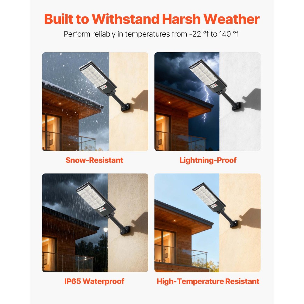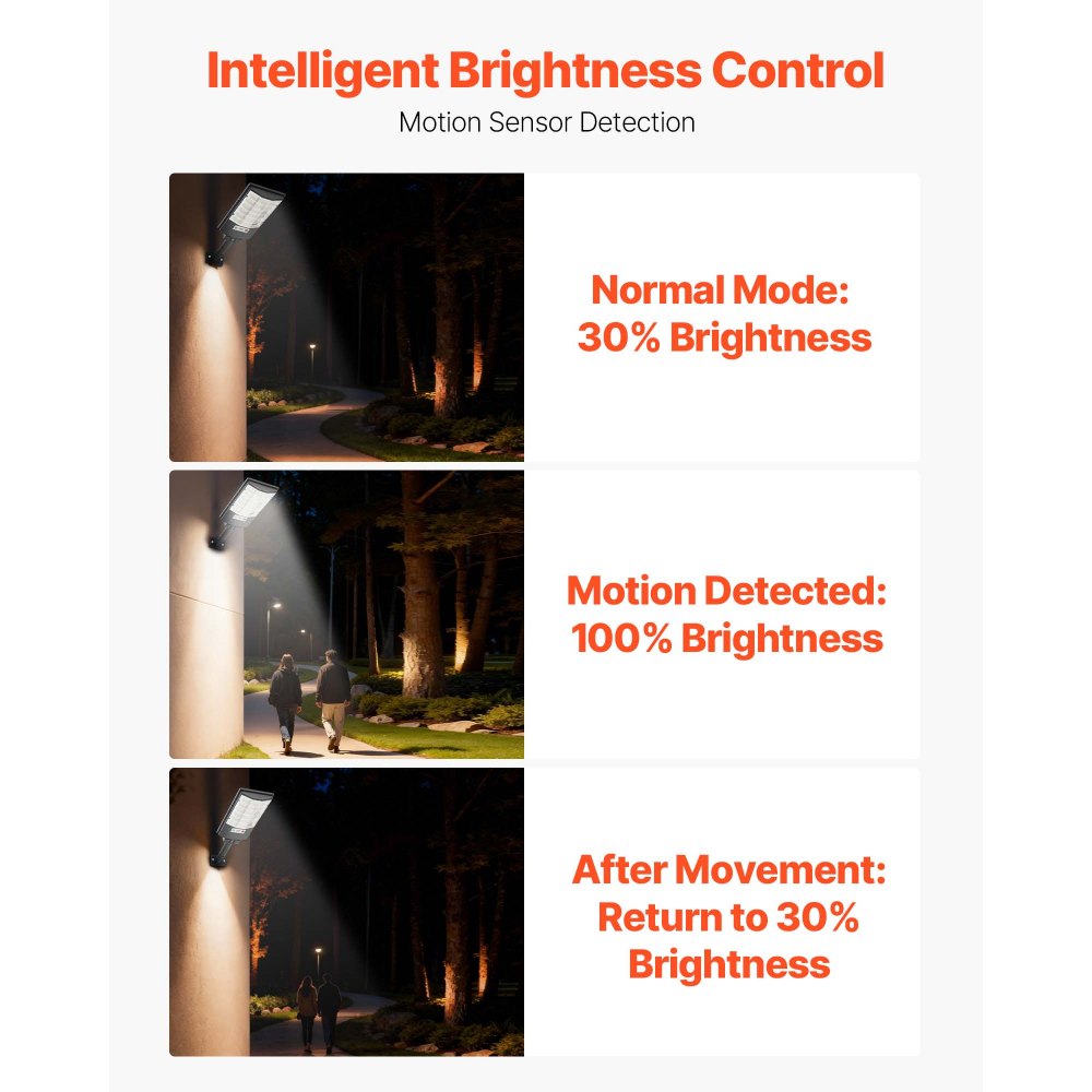 Φωτεινό Ηλιακό Φωτιστικό Δρόμου: Εξοπλισμένο με 5730 χάντρες LED υψηλής φωτεινότητας και εξοικονόμησης ενέργειας, αυτό το ηλιακό φωτιστικό δρόμου 500W για εξωτερικούς χώρους προσφέρει ισχυρή δέσμη ευρείας γωνίας 240° με εντυπωσιακή ένταση 50.000 lumen. Φωτίστε κάθε γωνιά της αυλής σας. Ηλιακή ενέργεια εξοικονόμησης ενέργειας: Πλήρως τροφοδοτούμενο από ηλιακή ενέργεια, το φως στάθμευσης μας συλλέγει ηλιακή ενέργεια και την αποθηκεύει σε μια μπαταρία λιθίου 5.000 mAh κατά τη διάρκεια της ημέρας. Μόλις φορτιστεί πλήρως, παρέχει έως και 20 ώρες συνεχούς φωτισμού τη νύχτα. Έξυπνος έλεγχος, ρυθμιζόμενος φωτισμός: Ελεγχόμενο μέσω τηλεχειριστηρίου RF, το ηλιακό φως δρόμου LED μας παρέχει 4 λειτουργίες. Ο αισθητήρας κίνησης ρυθμίζει αυτόματα τη φωτεινότητα, η ανίχνευση φωτός από το σούρουπο έως την αυγή ενεργοποιείται/απενεργοποιείται, η ρύθμιση χρονοδιακόπτη και η ρυθμιζόμενη φωτεινότητα. Ισχυρή αντοχή στις καιρικές συνθήκες: Με ενσωματωμένο σχεδιασμό, αυτό το ηλιακό φωτιστικό δρόμου είναι ανθεκτικό και ανθεκτικό στα ρωγμές. Με βαθμολογία αδιαβροχοποίησης IP65, λειτουργεί αξιόπιστα σε βροχή, χιόνι, υψηλές θερμοκρασίες και σκληρές εξωτερικές συνθήκες. Εύκολη εγκατάσταση και χρήση: Συνοδεύεται από όλα τα αξεσουάρ τοποθέτησης, το εμπορικό ηλιακό φωτιστικό εξωτερικού χώρου μας είναι εύκολο στην εγκατάσταση χωρίς καλωδίωση—απλώς στερεώστε το με βίδες. Ιδανικό για αυλές, δρόμους, αυλές, γκαράζ, μπαλκόνια, γήπεδα μπάσκετ και πλατείες.